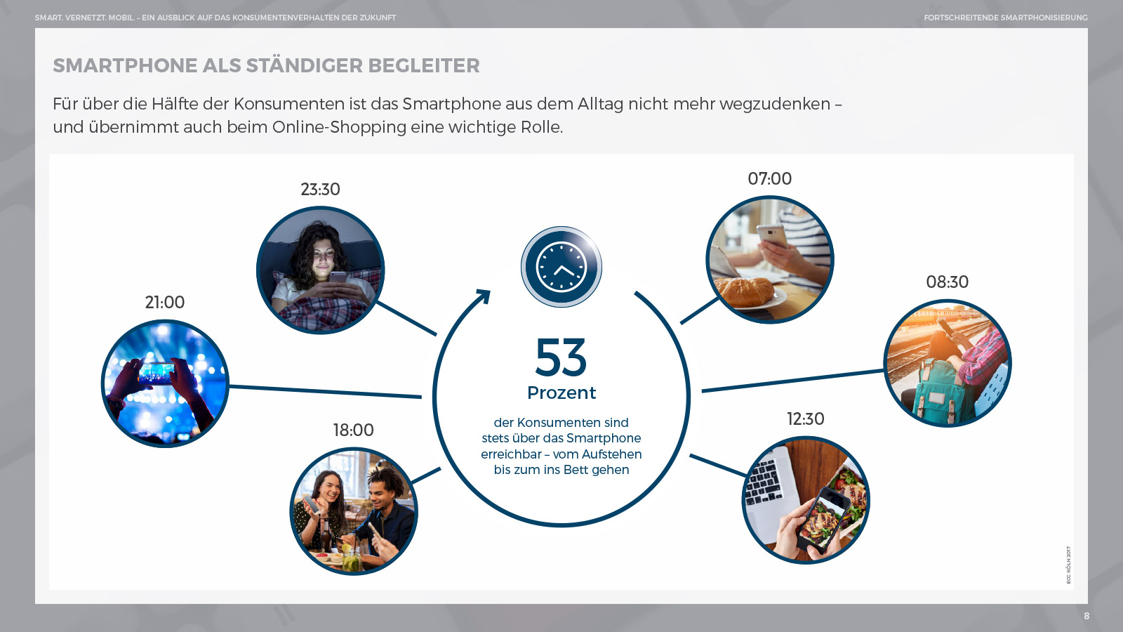 Wenn der Wecker klingelt, geht der erste Griff zum Handy. Vom Aufstehen bis zum ins Bett gehen wird das Smartphone mehr und mehr zu einem alltäglichen Begleiter der Konsumenten: So geben bereits 53 Prozent der Konsumenten an, stets über das Smartphone erreichbar zu sein – Tendenz steigend.