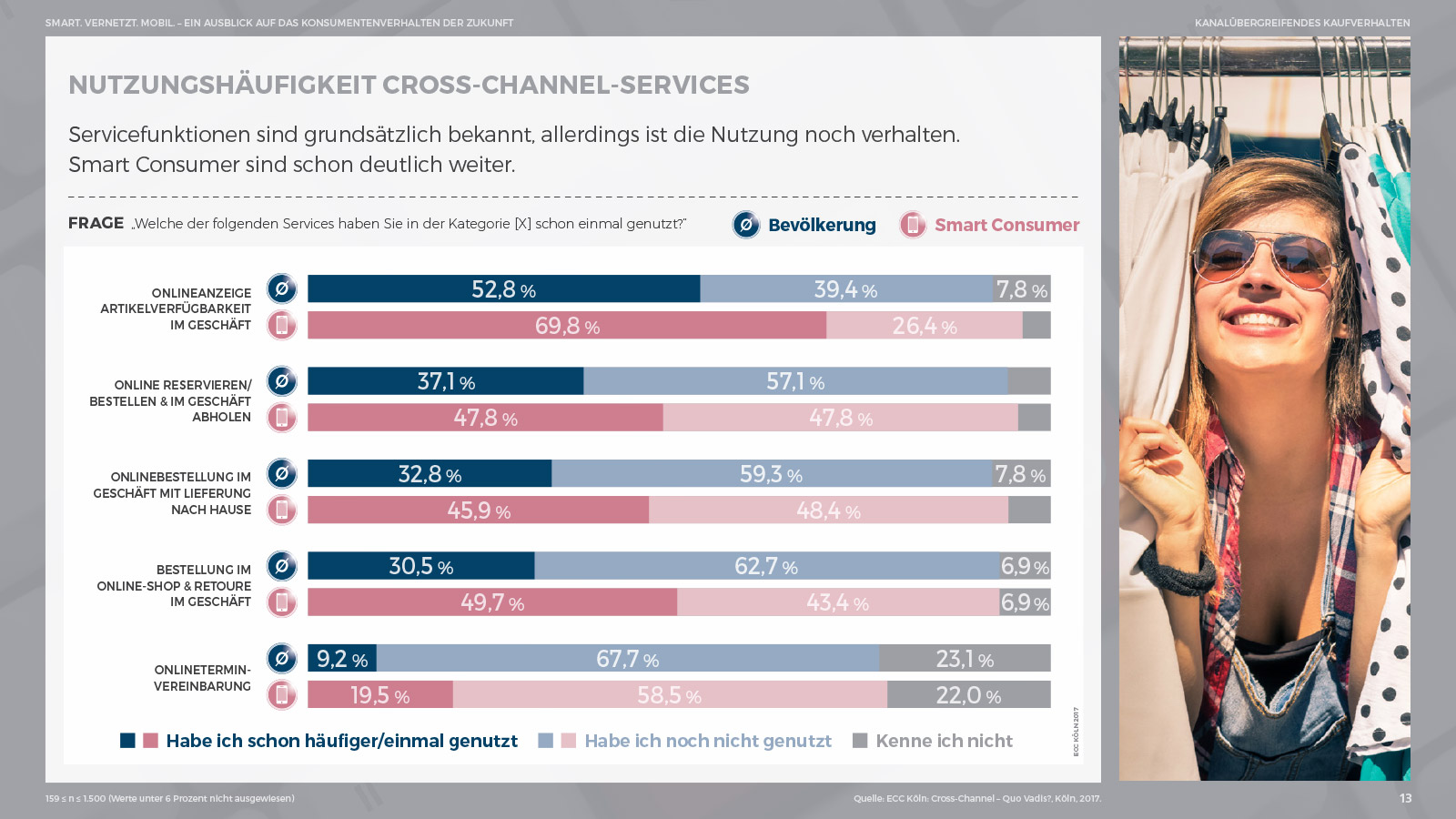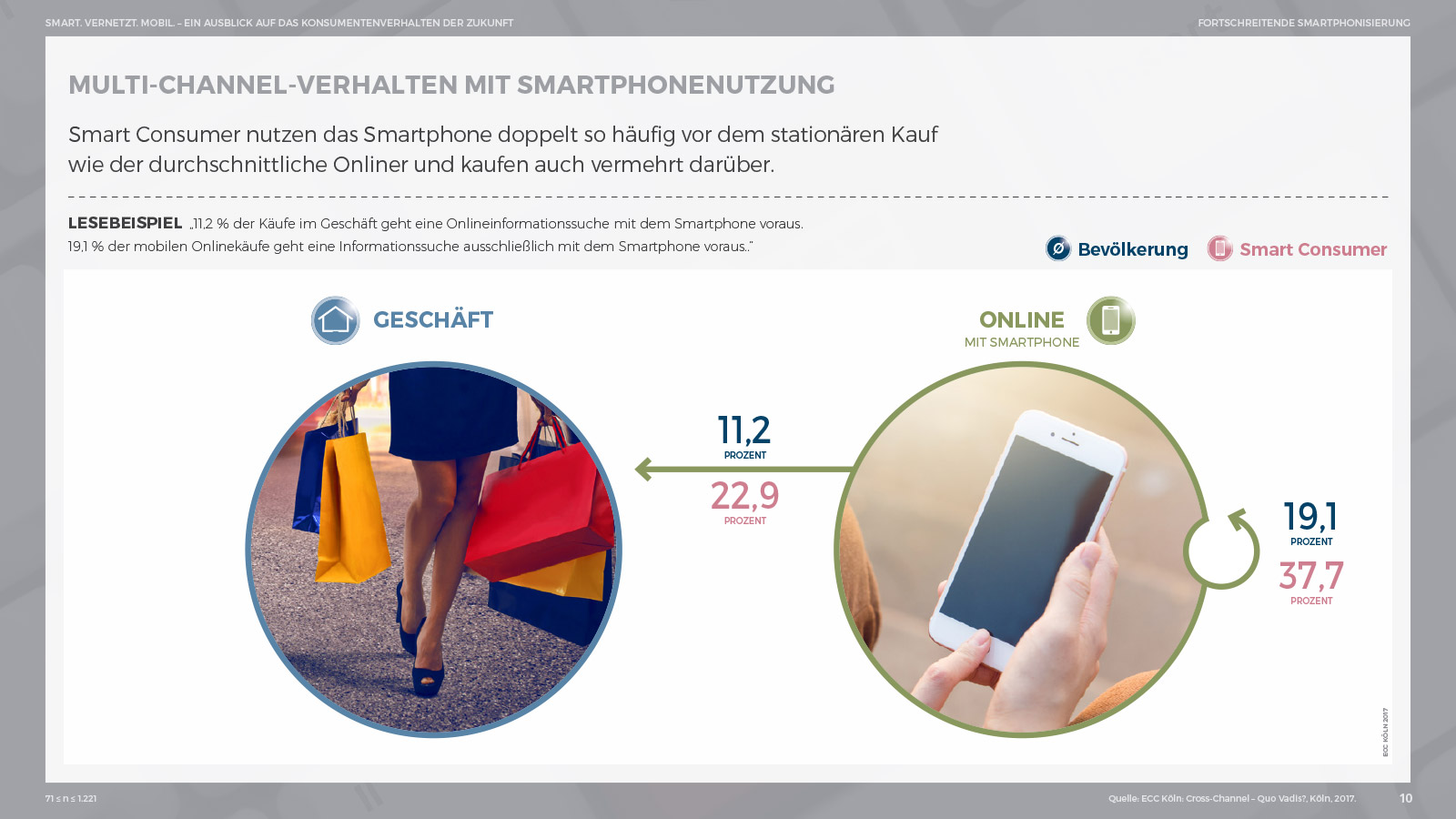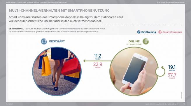 Die fortschreitende Präsenz des Smartphones verändert dabei nicht nur das Kommunikations-, sondern auch das Einkaufsverhalten. Welches Ausmaß diese Entwicklungen in Zukunft annehmen werden, zeigt ein Blick auf die Smart Consumer, die besonders smartphoneaffine Konsumentengruppe. Sie nutzen das Smartphone als Informationsmedium vor dem stationären Kauf doppelt so häufig wie der durchschnittliche Konsument. Bei der Informationssuche vor dem Onlinekauf kommt das Smartphone sogar bei 38 Prozent der Smart Consumer zum Einsatz. Aber auch beim Kaufabschluss nimmt das Smartphone eine immer wichtigere Rolle ein. Hierdurch werden Konsumenten spontane Käufe ermöglicht – ortsunabhängig, 24 Stunden am Tag, sieben Tage die Woche. Diese Entwicklung erhöht die Informationsdichte und Geschwindigkeit im Handel rasant.