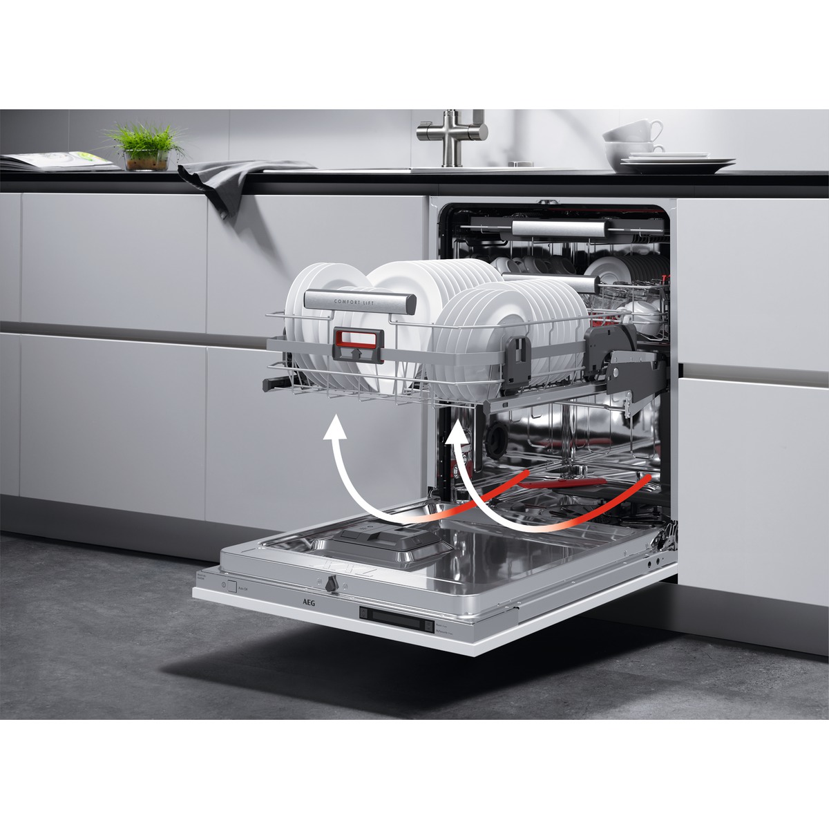 Bequemer geht’s nicht: Dank ComfortLift® hebt sich der untere Korb mit einem Handgriff sanft nach oben, auf eine bequeme Arbeitshöhe. So lässt sich der Geschirrspüler mühelos und ohne Bücken ein- und ausräumen.