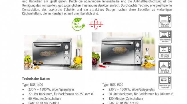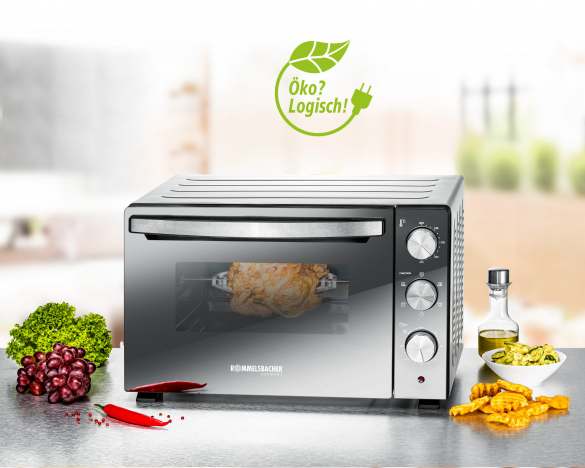 Der Backofen kann mit verschieden kombinierten Heizarten aus Oberhitze, Unterhitze und Umluft betrieben werden. Durch die stufenlose Temperaturregelung heizt der Backraum sehr schnell auf und ist perfekt für die Zubereitung von Braten, Aufläufen und Kuchen. Mit dem Drehspieß-Set lassen sich außerdem Rollbraten und Hähnchen am Spieß grillen. Durch die abnehmbare Innenscheibe und die Antihaftbeschichtung ist die Reinigung des kompakten, gut zugänglichen Innenraums denkbar einfach. Durchdachte Technik, energieeffiziente Konstruktion, das praktische Zubehör und ein attraktives Design machen diese Backöfen zu vielseitigen Küchenhelfern, die im Haushalt schnell unentbehrlich sind.