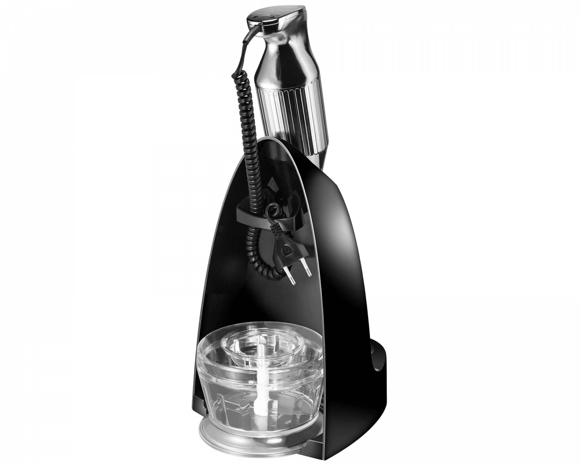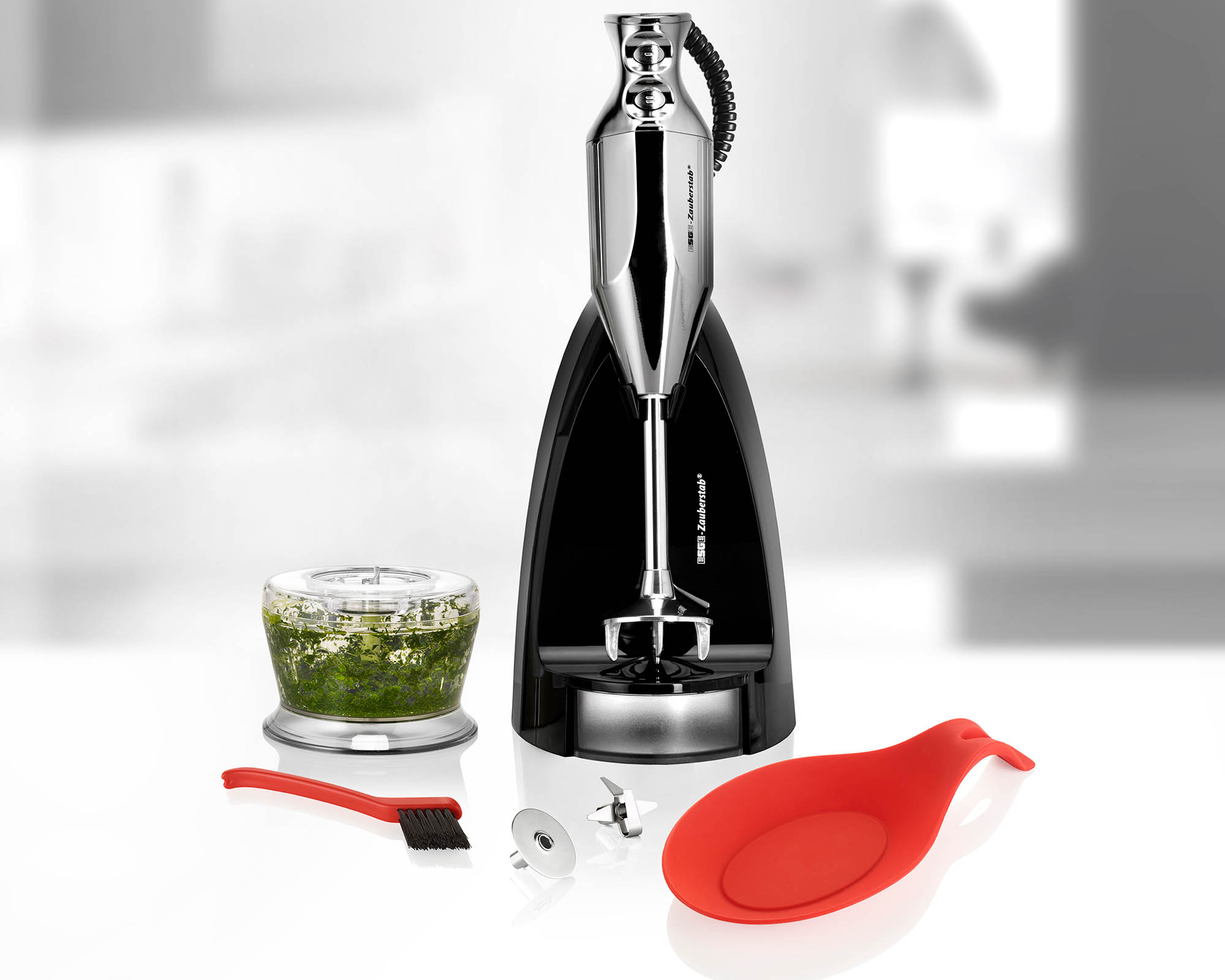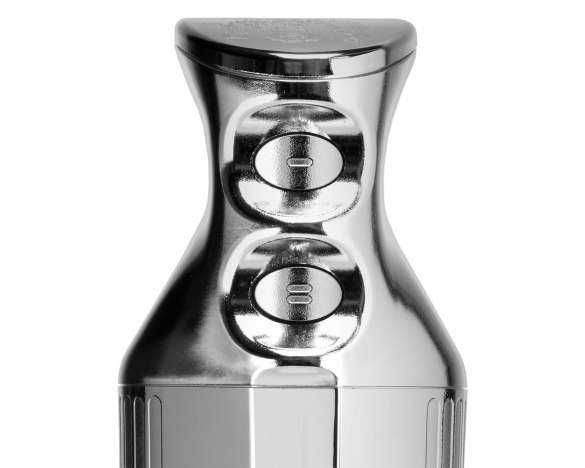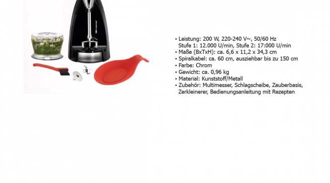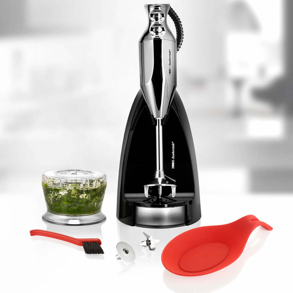 Jede Menge „Drumherum“ gibt es zum schicken ESGE-Zauberstab® M 200 Chrom: Abstellen lässt er sich in der Zauberbasis, in der auch Multimesser und Schlagscheibe untergebracht werden. Außerdem gehört der Zerkleinerer für Nüsse, Schokolade, Käse und Kräuter dazu. Die Ablageschale aus Silikon und die Reinigungsbürste für die Aufsteckteile runden das Paket ebenso ab wie die Bedienungsanleitung mit Rezepten. Für 12.000 oder 17.000 Umdrehungen pro Minute sorgt der Sicherheits-Twinschalter, die der robuste, langlebige AC-Motor „Made in Switzerland“ locker schafft!