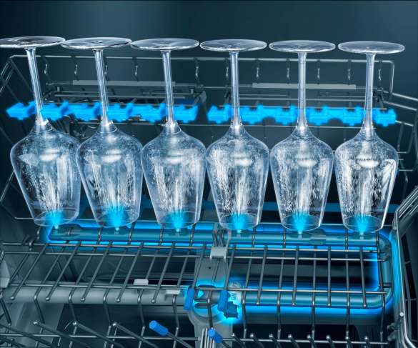 Ein weiteres Highlight, das Spülen jetzt noch bequemer macht, ist die neue glassZone. Mit ihr hat Siemens Hausgeräte einen „Prioritybereich“ für wertvolle Gläser geschaffen: Sechs integrierte Düsen säubern sie mit sanfter, kontinuierlicher Wasserzufuhr ebenso gründlich wie schonend. Und egal ob Tumbler oder Tulpe: Jede Glasform steht dabei sicher auf soften Anti-Rutsch-Elementen: Wein- und Sektgläser erhalten für ihre Stiele durch weiche Anlageflächen ebenfalls zusätzlichen Halt. Für glänzende Spülergebnisse sorgt das patentierte Zeolith-System. Es verwandelt Feuchtigkeit mithilfe des gleichnamigen, natürlichen Minerals in Wärme um, die für ein glänzendes Trockenergebnis sorgt. Das Resultat: Gastgeber können nun auch wertvolle Gläser, die man sonst noch gerne per Hand gespült hat, beruhigt in die Spülmaschine stellen und sparen sich dabei sogar das Nachpolieren. Denn dank der neuen glassZone gehören Wasserflecken und -ränder der Vergangenheit an.