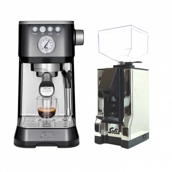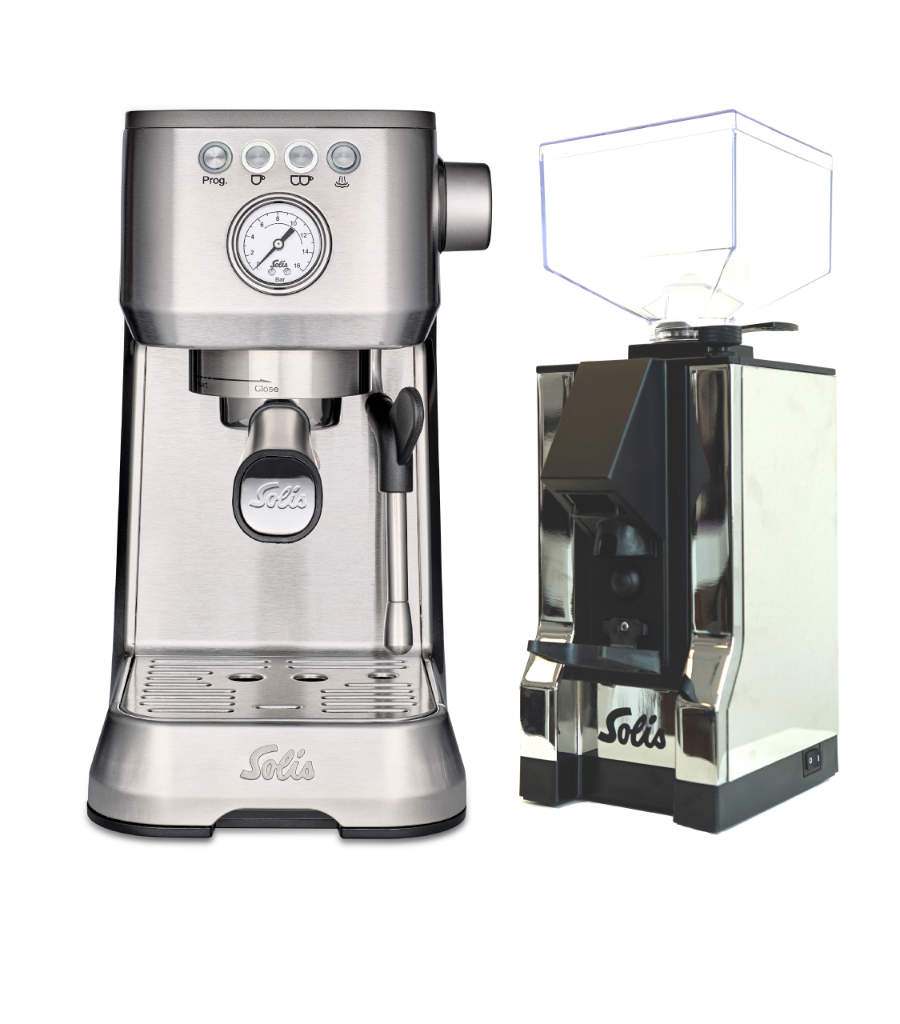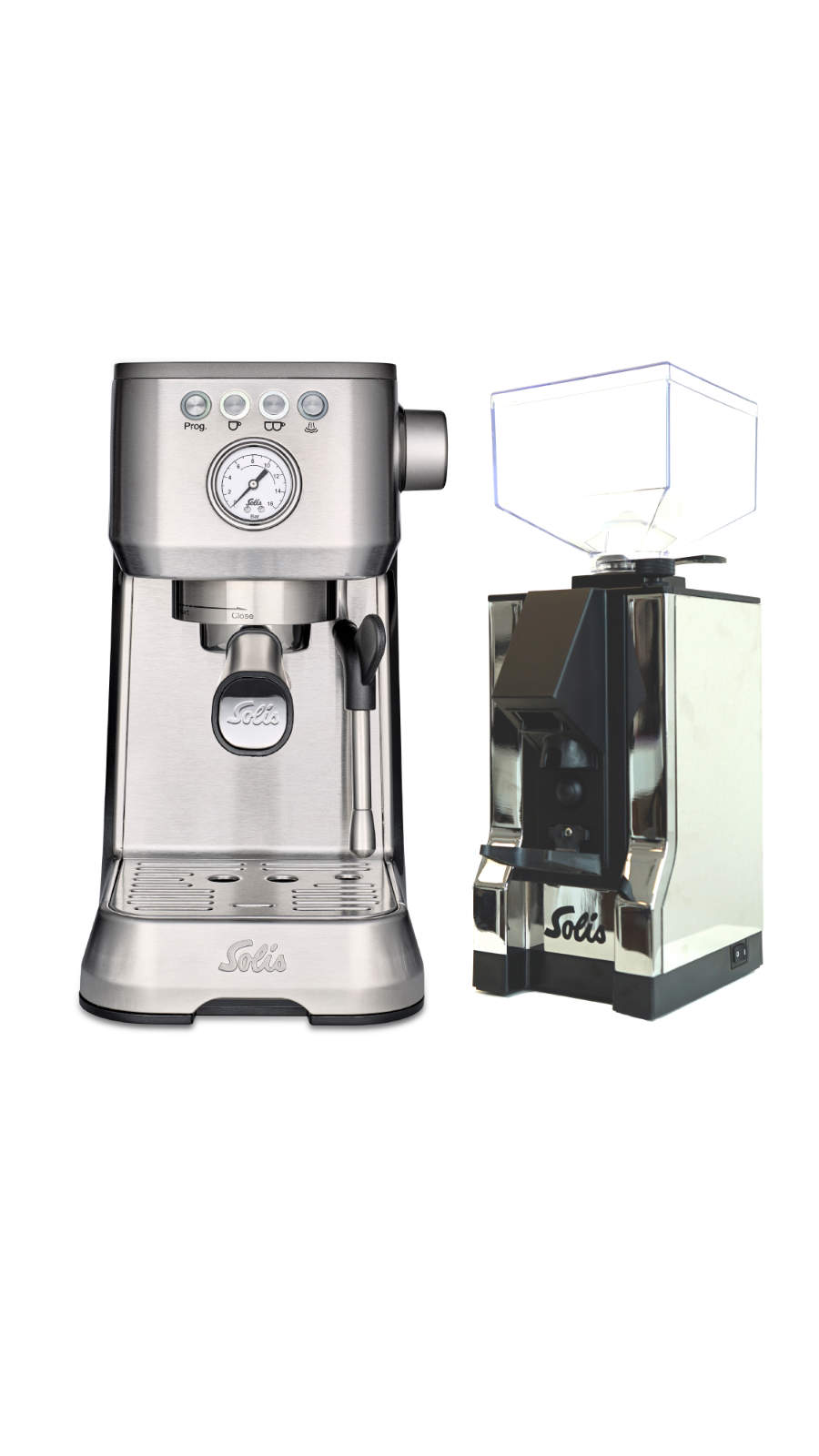 Zur Einführung bieten wir die SOLIS Eureka Mignon Kaffeemühle im verkaufsfördernden PROMO- Pack zusammen mit dem SOLIS Siebträger Barista Perfetta Plus an!