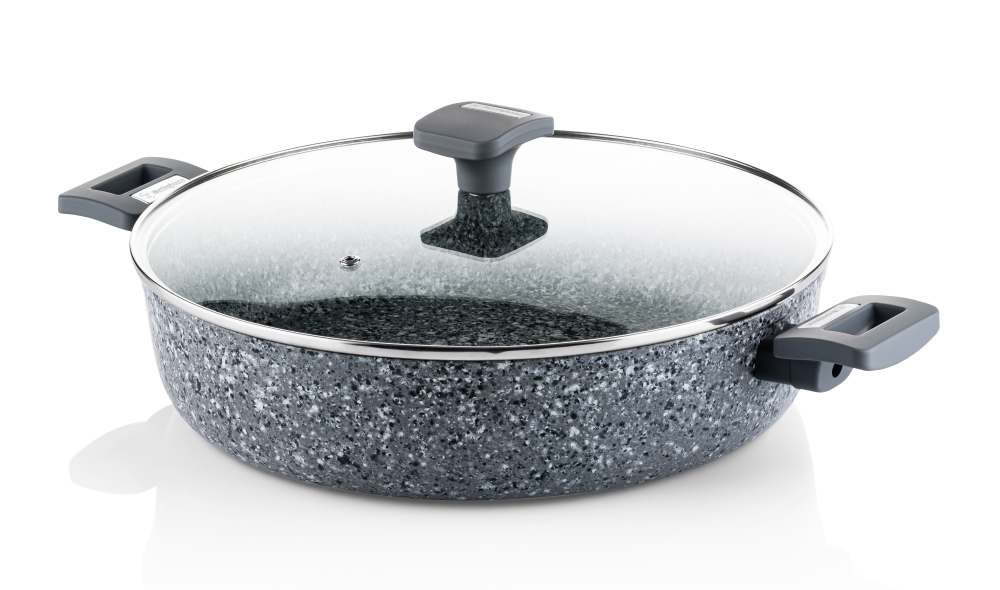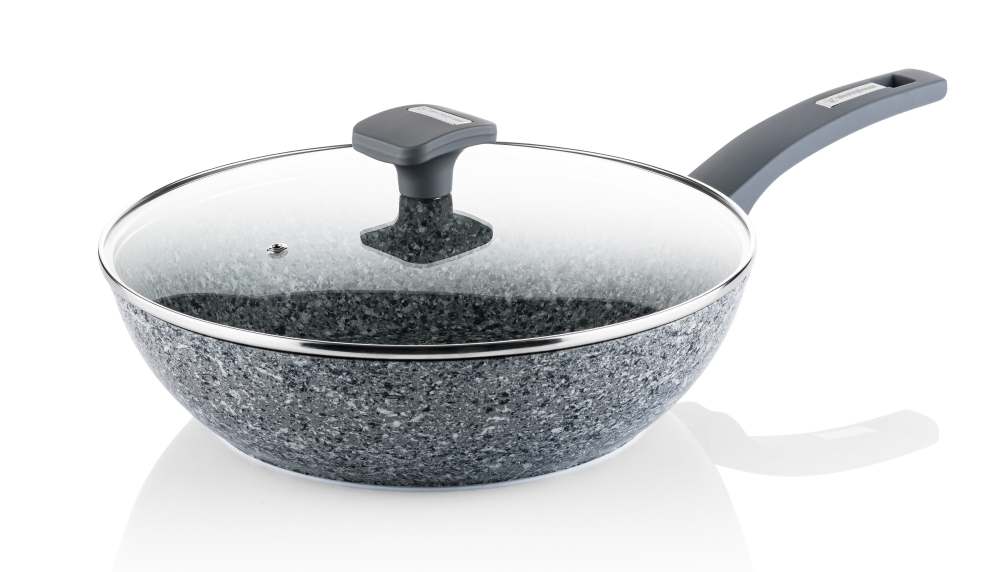 Dank Antihaftbeschichtung mit grauer Granitoberfläche lässt sich der Verbrauch von Öl oder Butter beim Kochen reduzieren, während man gleichzeitig lästige Kratzer vermeidet. Dabei sorgt der flache und dicke Boden für eine gleichmäßige Wärmeverteilung, was die Zubereitung des perfekten Pfannen-, Wok- oder Schmorgerichts wesentlich kontrollierbarer macht und somit stark vereinfacht.