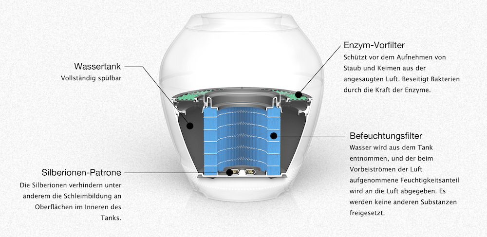 Balmuda hat beim Rain größten Wert auf Hygiene gelegt. Aus meiner Sicht ist das sehr wichtig, denn zu einem gesunden Raumklima gehört eben nicht nur die richtige Luftfeuchtigkeit, sondern auch saubere Luft. Das japanische Unternehmen hat für den Rain deshalb folgenden Aufbau gewählt: