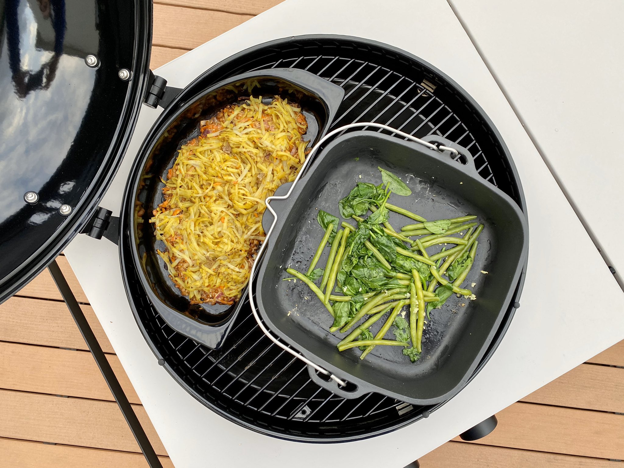 Ebenso einfach funktioniert natürlich auch der Aufbau. Ich habe bei der ersten Inbetriebnahme keine fünf Minuten gebraucht, bis der Barbecue Grill einsatzbereit war. Das elektrische Heizelement, das stolze 2.400 Watt liefert, ist übrigens abnehmbar. Dadurch lässt sich die antihaftbeschichtete Grillplatte komplett entnehmen. Letztere ist in zwei Zonen geteilt: eine glatte Hälfte für “empfindliche” Speise und eine geriffelte für die Röststreifen, die bekanntlich bei keinem Steak vom Grill fehlen sollten.
