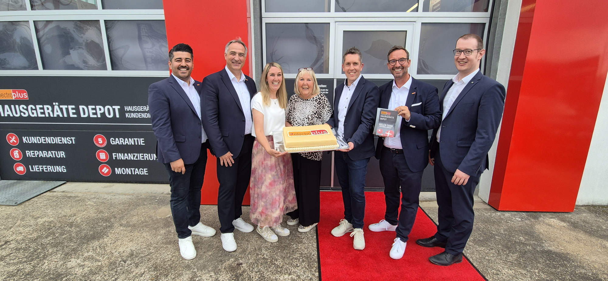 Das Opening (v.l.n.r.): Ali Uyar (Store Designer electroplus), Christian Bichlmeier (Regional Sales Manager, EK Retail), Patrizia Seifert (Hausgeräte Depot), Renate Bahler (Gründerin Hausgeräte Depot), Alexander Bahler (Hausgeräte Depot), Martin Wolf (General Manager EK Home Electrical Appliances), Maximilian Friedrich (Oberbürgermeister Backnang) feiern die Eröffnung von electroplus Hausgeräte Depot in Backnang.