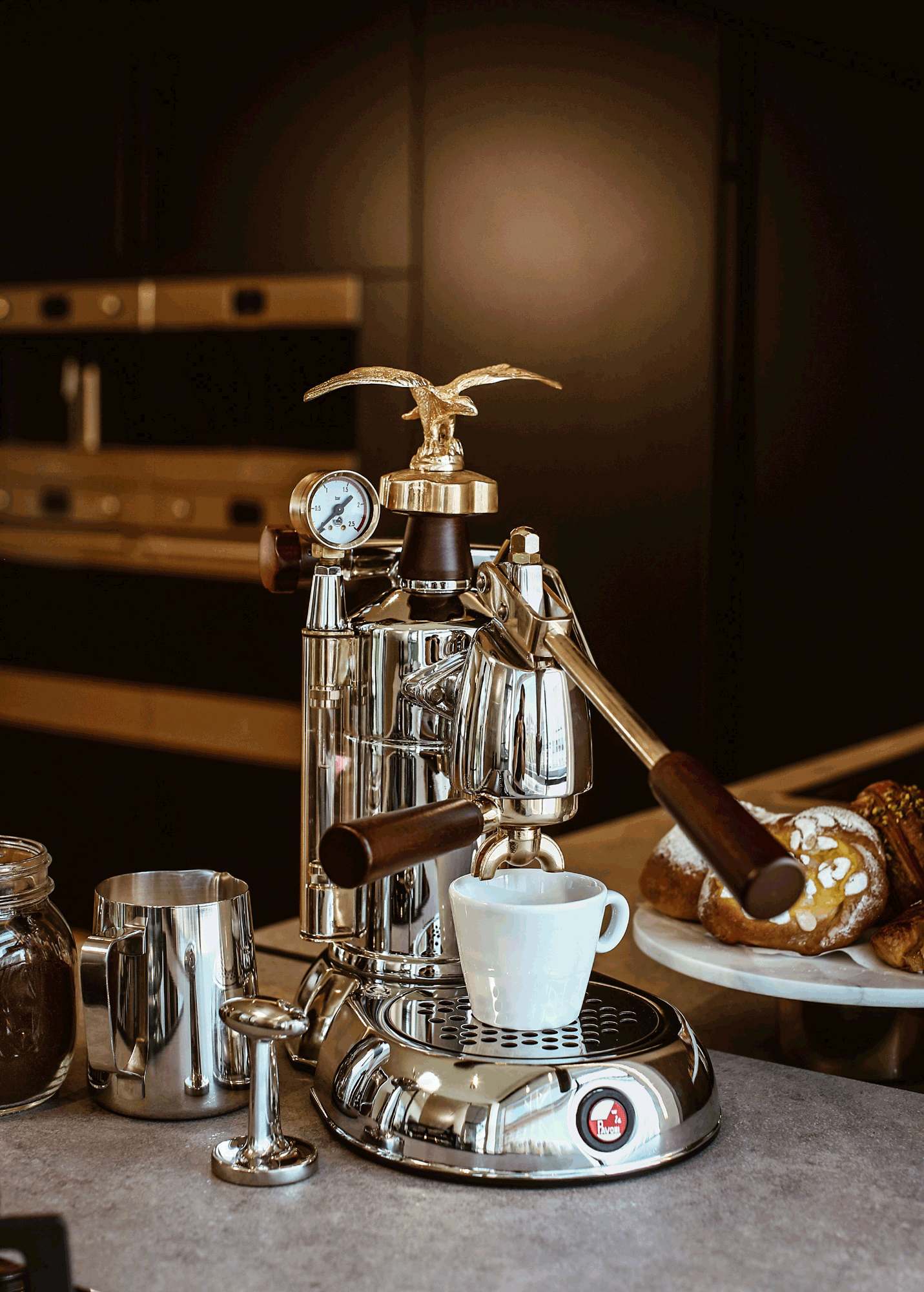 Die Espressomaschine Geniale wiederum wurde in der Entwicklung besonders auf Langlebigkeit und Robustheit getrimmt. Auch sie ist in Perlweiß oder Dunkelgrau sowie mit zwei oder drei Brühgruppen verfügbar. Auch Betreiber von kleinen Bars und Cafés können ihren Gästen einen perfekten Espresso aus einer echten la Pavoni bieten. Je nach Ambiente und Bedarf gibt es die „Pub“ mit rubinroten, schwarzen oder weißen Seitenelementen sowie mit ein oder zwei Brühgruppen. Das Automatikmodell Pub V zeichnet sich durch eine programmierbare Dosierung der Wassermenge aus.