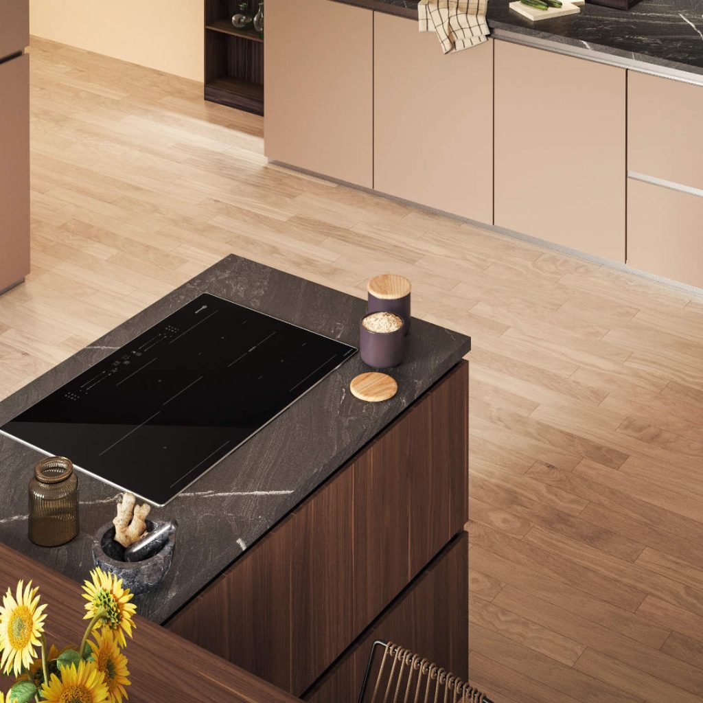 Die CleanProtect-Induktionskochfelder punkten mit ihrer schwarzen, eleganten Oberfläche und einem gebürsteten Aluminiumrahmen. Spezielle Schieberegler für jede Kochzone ermöglichen eine intuitive Interaktion während des Kochens. Zu den praktischen Highlights gehört außerdem das schlanke Design des Kochfeldes. Dank der fugenlosen Konstruktion verschmilzt das Kochfeld praktisch nahtlos mit der darunterliegenden Arbeitsplatte und sorgt so für ein harmonisches Gesamtbild.