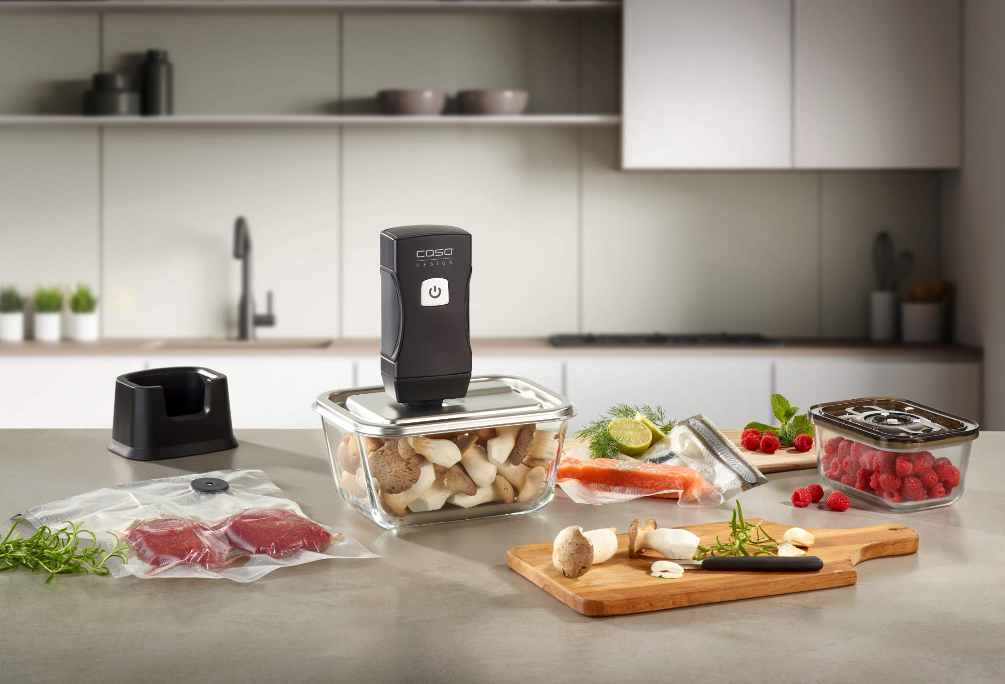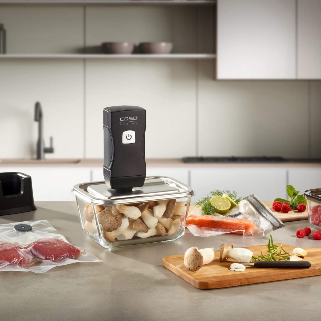 Mit einem Vakuumierer lässt sich Grillgut innerhalb weniger Minuten marinieren. Durch den Unterdruck werden Aromen schneller und intensiver aufgenommen. CASO Design bietet hier verschiedene Lösungen – vom kompakten Handvakuumierer bis zum vollausgestatteten Balkenvakuumierer.