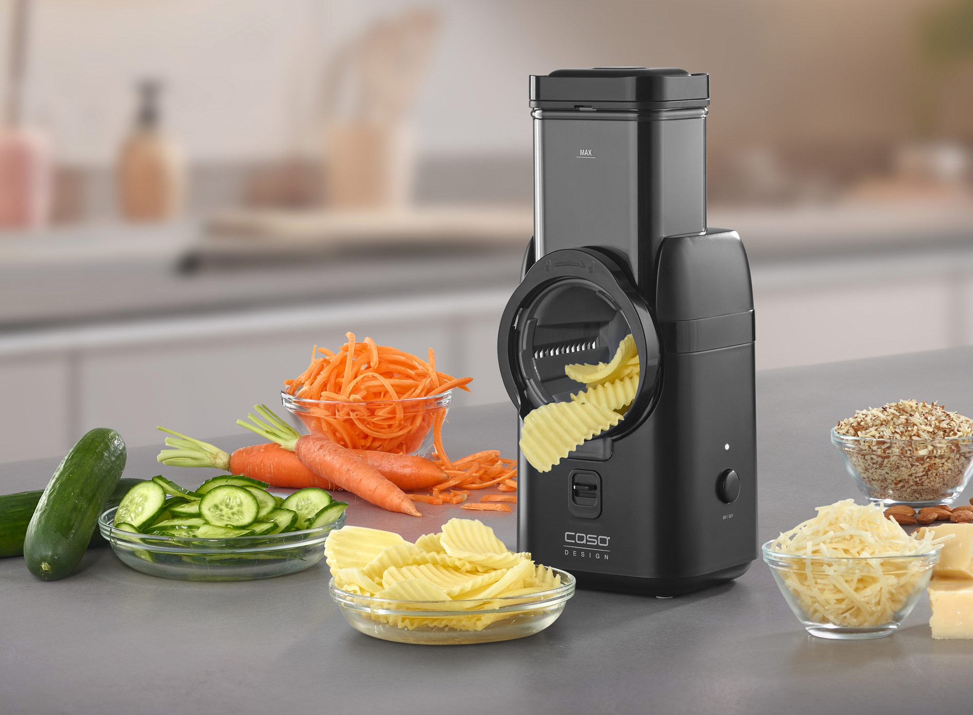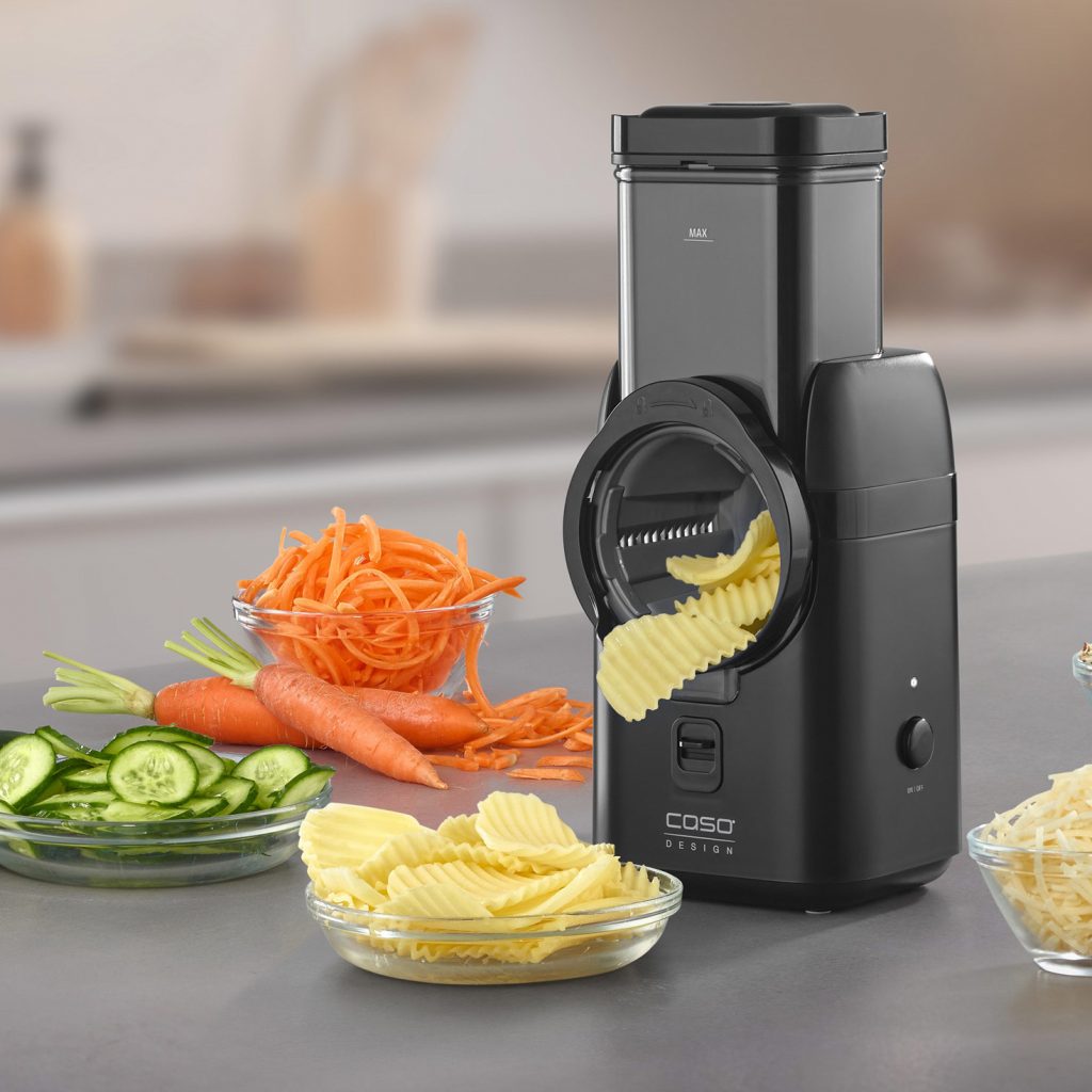 Der MultiSlicer eignet sich mit fünf verschiedenen Einsätzen zum Reiben, Raspeln und Schneiden. Der Chop & Go Multizerkleinerer zerkleinert Zutaten kabellos und unterstützt auch beim Aufschlagen und Emulgieren von Dips und Dressings.