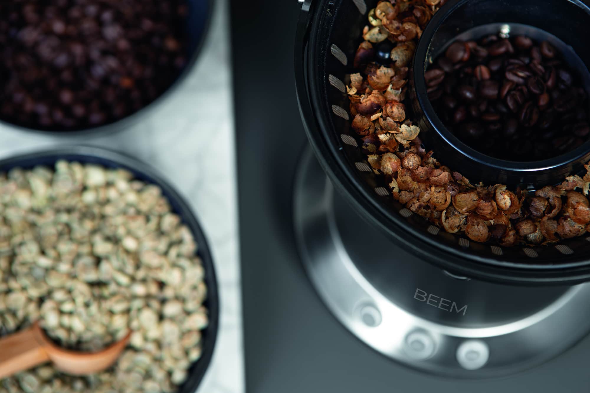 Eine davon ist der Kaffeeröster Roast-Perfect, mit dem es jetzt ganz einfach gelingt, zuhause rohe Kaffeebohnen selbst zu rösten. Einfach einfüllen, einstellen, einschalten – der Kaffeeröster von Beem ist schnell einsatzbereit und leicht zu bedienen. In den zwei automatischen Röstungsgraden, Dark und Medium, entfalten die Bohnen ihren vollen Geschmack. Dabei steigt die Temperatur in mehreren Intervallen auf maximal 200 °C. So lassen sich nach rund einer halben Stunde Röstung und Cooldown bis zu 100 g Rohkaffee verarbeiten.