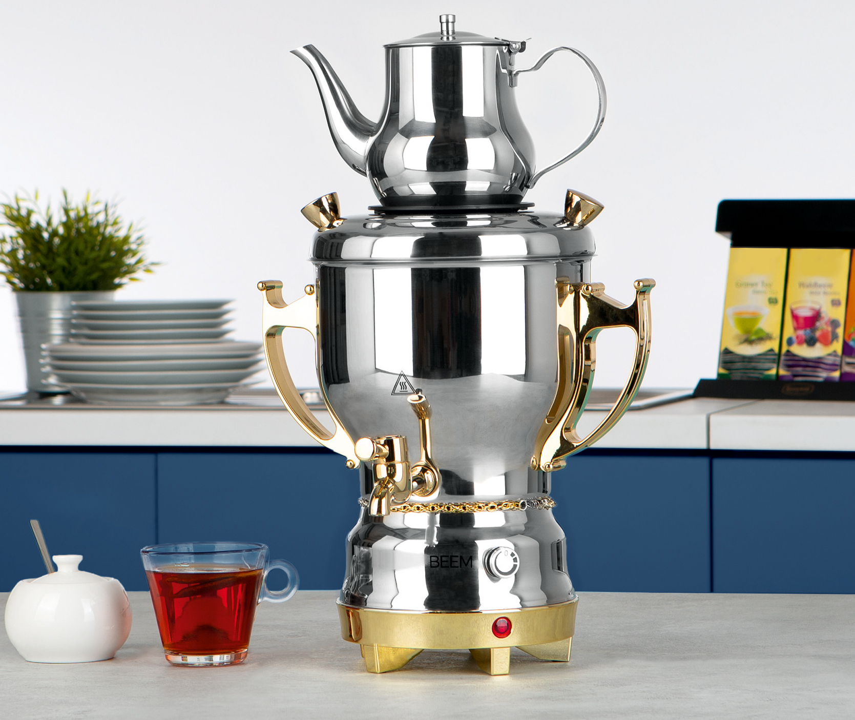 Der Beem Samowar Tea-Classic ist mit feinen Elementen aus vergoldetem Edelstahl verziert.