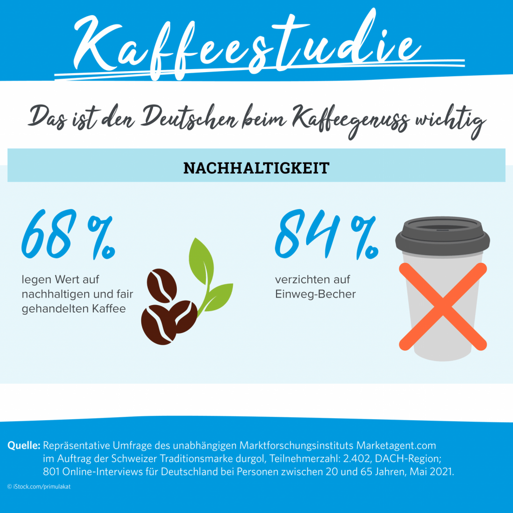 Für die deutschen Kaffeegenießer steht fest: Nachhaltigkeit bei der Wahl der Kaffeebohnen und Sauberkeit bei der Kaffeemaschine gehen Hand in Hand. Zwei Drittel (68%) achten auf fair gehandelte und nachhaltig angebaute Bohnen. Wird die Maschine zudem ordentlich gereinigt, verspricht das für 81% den puren Genuss. Dies zeigt eine Studie von durgol, der Schweizer Marke für hochwertige Entkalkungs- und Reinigungsmittel. In Zusammenarbeit einem Marktforschungsinstitut befragte durgol 2.402 Personen in Deutschland, Österreich und der Schweiz zu ihrem Kaffeekonsum.