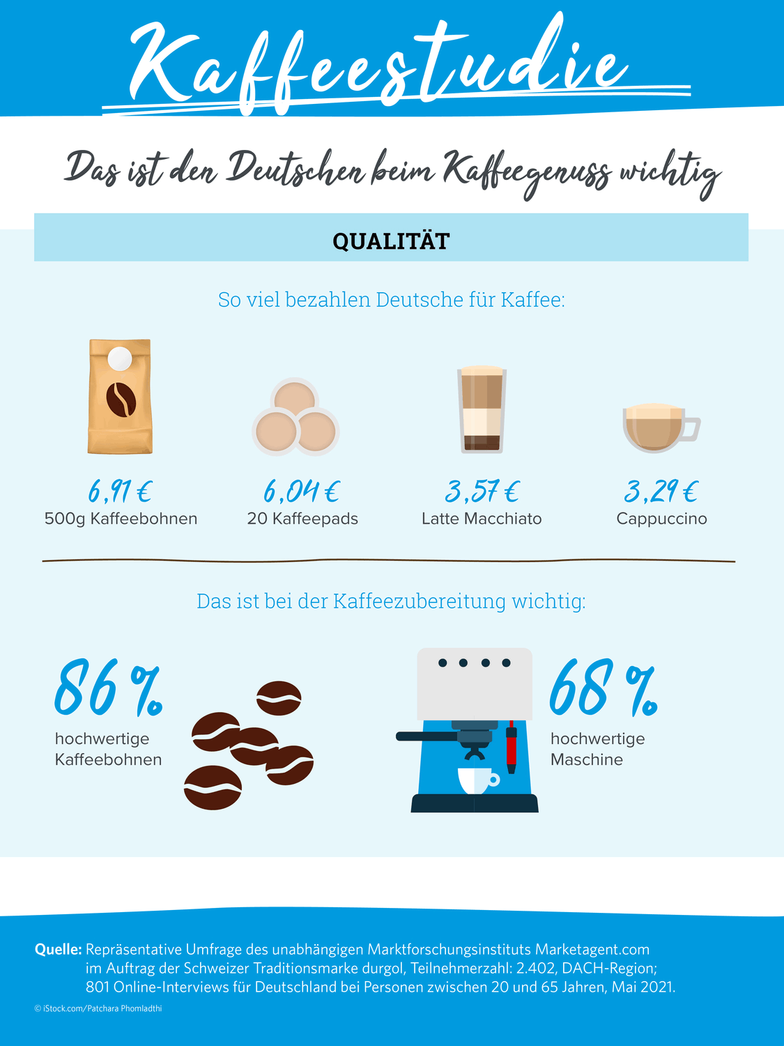 Wie viel lassen sich die Deutschen diesen Genussmoment kosten? Wenn es um Kaffee geht, muss es für 51 Prozent nicht preisgünstig sein. Im Schnitt sind die Bundesbürger bereit, 3,29 Euro für einen Cappuccino oder 3,57 Euro für einen Latte Macchiato in einem Café oder Restaurant auszugeben. Bei einem Pfund Kaffeebohnen aus dem Laden liegt die Schmerzgrenze bei 6,91 Euro, für eine Packung Kaffee-Pads bei 6,04 Euro. Damit es auch wirklich schmeckt, bevorzugen zwei Drittel der Deutschen (65%) hochpreisige Kaffeevollautomaten, Espressomaschinen und Co.