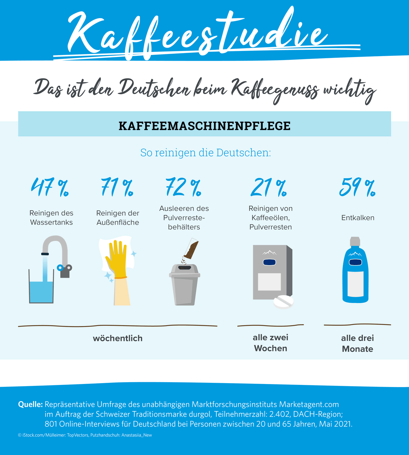 Einem Großteil der Befragten ist eine gereinigte (81%) und entkalkte (82%) Maschine bei der Kaffeezubereitung wichtig. Doch im Alltag hapert es noch bei der Umsetzung: Nur 21% reinigen die Geräte auch von innen hygienisch und lösen mindestens alle zwei Wochen Kaffeefette, Öle und Pulverreste. Jeder Zweite (59%) befreit Vollautomat, Siebträger oder Filter- und Kapselmaschine alle drei Monate von Kalkablagerungen. Wert auf ein sauberes Äußeres legen dagegen viele: 71% kümmern sich mindestens einmal pro Woche um die Außenflächen, damit hier alles blitzt und blinkt.