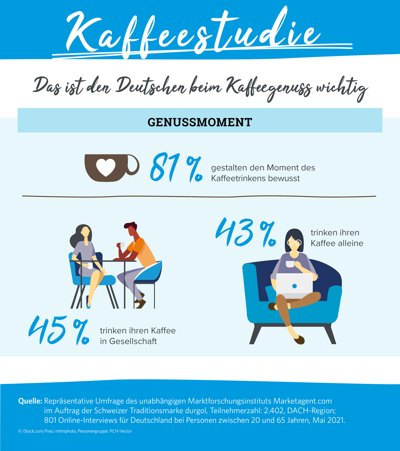 Bei der Zubereitung sind sich die Befragten einig: Es muss einfach und schnell gehen (88%). Denn ist der Kaffee rasch gebrüht, bleibt mehr Zeit für das genussvolle Konsumieren: Das Heißgetränk dient nicht nur als Wachmacher, ganze 81% gestalten den Moment des Kaffeetrinkens. Die einen mögen es in Gesellschaft mit Familie und Freunden (45%), die anderen trinken ihre Tasse gern für sich allein (43%). Mehr als die Hälfte der Deutschen (55%) nimmt sich dabei Zeit, den Kaffee bewusst zu genießen.