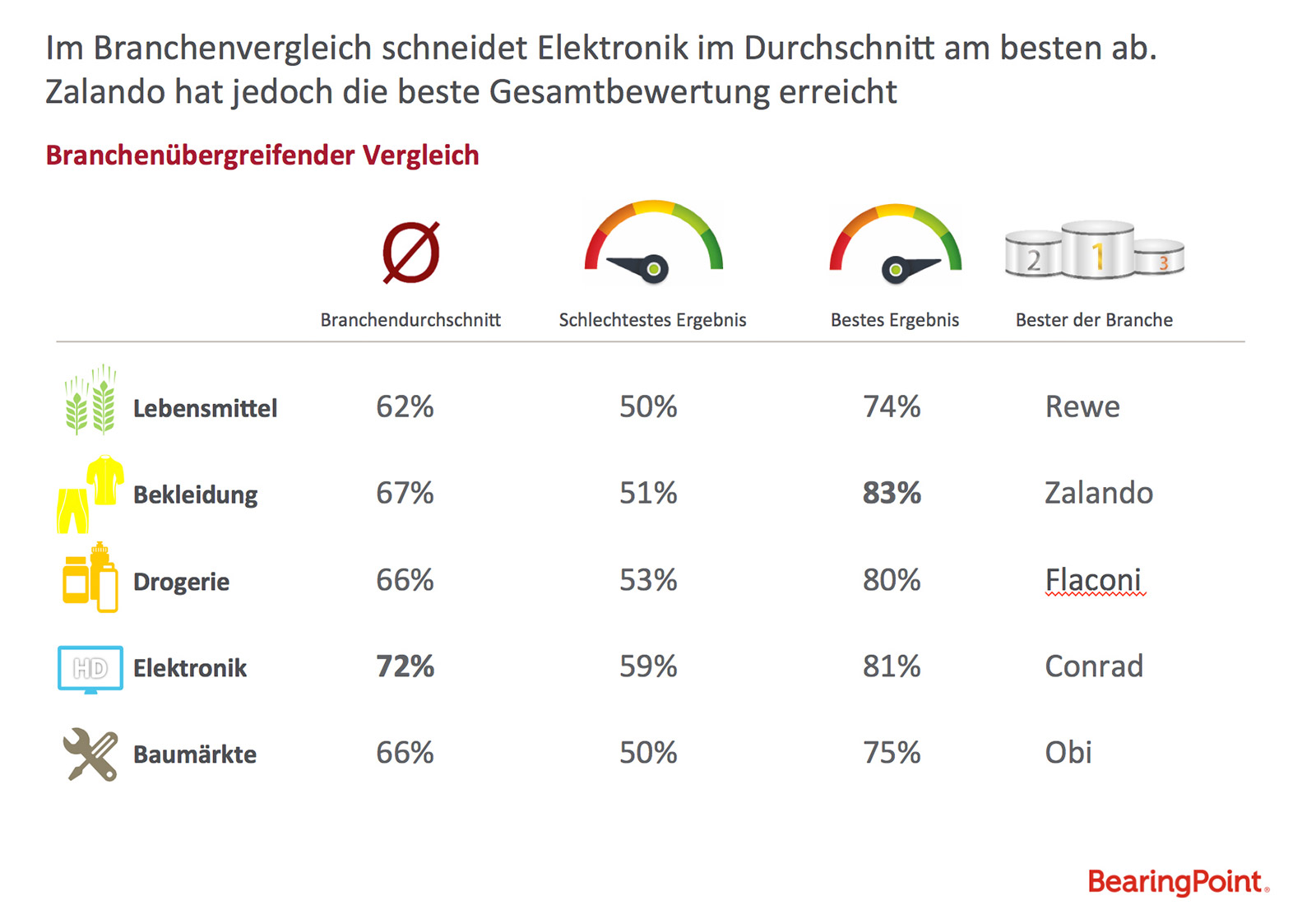Der Studie zu Folge erzielt Zalando die beste Gesamtwertung. Weitere Spitzenreiter in den jeweiligen Branchen sind Conrad, Flaconi, Obi und REWE. Allerdings gibt es große Leistungsunterschiede zwischen den einzelnen Shops: Am besten abgeschnitten haben im Branchendurchschnitt die Elektronikhändler, am schlechtesten die Lebensmittelbranche ganz knapp hinter Baumärkten und Möbelhändlern.