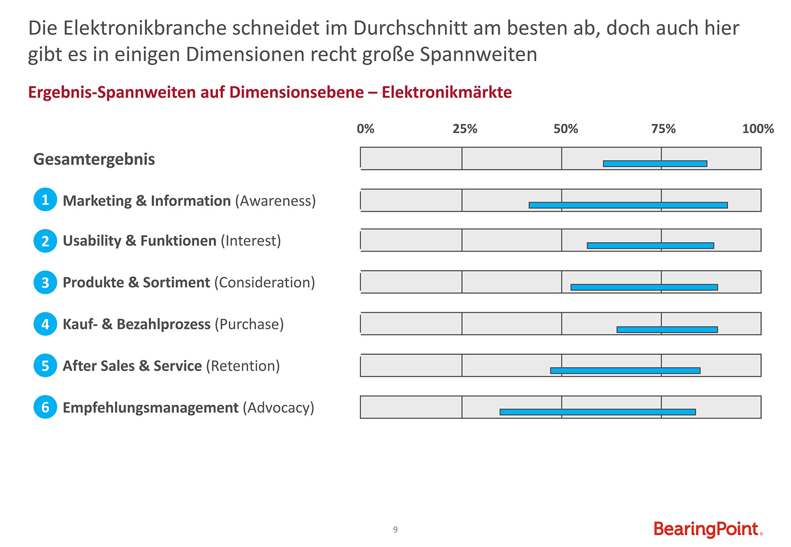 Nur wenige Händler erfüllen die Erwartungen deutscher Kunden an einen modernen Online-Shop, so das Ergebnis einer aktuellen Studie der Unternehmensberatung BearingPoint, Frankfurt, zum Thema Digital Retail Benchmarkt 2016. Untersucht wurden 85 Online-Shops aus fünf Einzelhändler-Kategorien anhand eines Punktesystems ihres Reifegrads: Lebensmittel, Bekleidung und Schuhe, Drogerie und Parfümerie, Elektronik sowie Baumärkte und Möbelhändler.