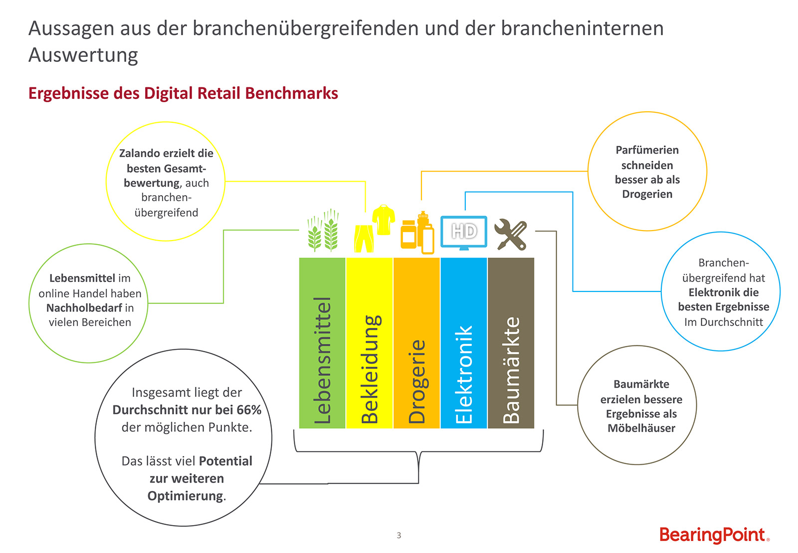 Im Bereich Bekleidung und Schuhe lassen sich in der Kategorie Produkt und Sortiment nur in wenigen Shops Produkte komfortabel suchen und vom Kunden entsprechend sortieren. Nur bei führenden Anbietern wie Zalando wird die Suche durch ausführliche Filtermöglichkeiten unterstützt. Unter Drogerien und Parfümerien schnitten Online-Parfümerien wie Flaconi tendenziell besser ab als ihre Multichannel- und Drogerie-Konkurrenz, was auf die Unterschiede im Auffinden des Online-Shops sowie im Empfehlungsmanagement zurückzuführen ist.