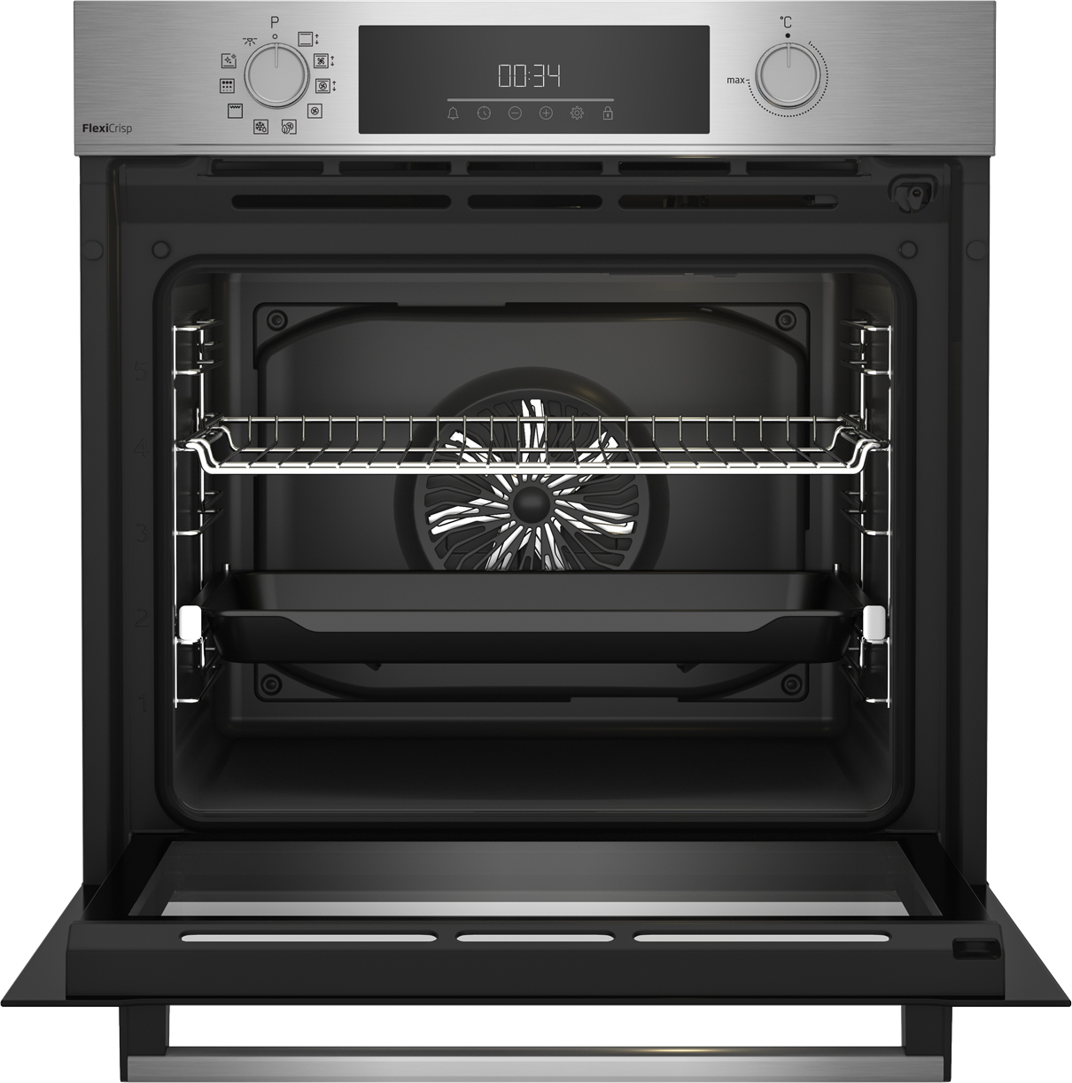 Der Backofen ist 60 Zentimeter breit und hat einen 72 Liter großen Garraum mit fünf Einschubebenen. Zur Ausstattung gehören neben FlexiCrisp und der pyrolytischen Selbstreinigung ein übersichtliches LED-Multifunktionsdisplay mit Touch-Funktion, versenkbare Bedienknebel, ein komfortabler Teleskopauszug und die SteamShine-Dampfreinigung.