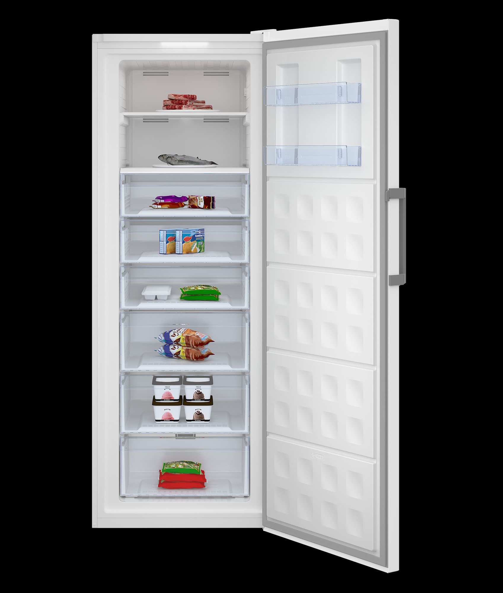 Der Gefrierschrank bietet 404 Liter Nutzinhalt. Die sechs Gefrierschubladen und zwei Gefrierfächer ermöglichen eine übersichtliche Lagerung der Produkte. Durch die Supergefrierschaltung werden die Lebensmittel noch schneller eingefroren.