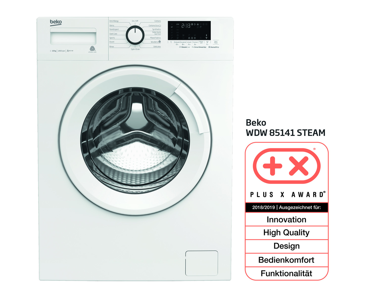 Der Waschtrockner WDW 85141 STEAM kann in fünf von sieben möglichen Kategorien beim Plus X Award 2018/2019 überzeugen. Die Jury prämierte das Gerät von Beko in den Kategorien Innovation, High Quality, Design, Bedienkomfort und Funktionalität. Der Waschtrockner rangiert in der höchsten Energieeffizienzklasse A und sorgt mit innovativen Technologien für eine gründliche und gleichzeitig schonende Wäschepflege.