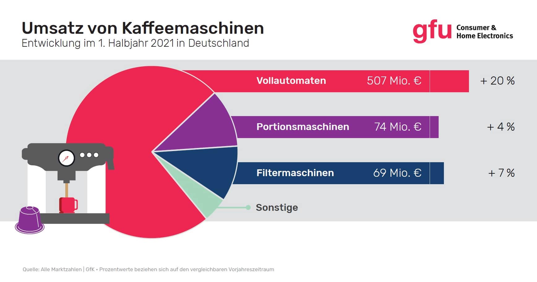 Kaffee-Portionsmaschinen, bei denen Kapseln oder Pads verwendet werden, liegen mit einem Umsatz von 74 Millionen Euro (+4%) auf Platz zwei, gefolgt von den traditionellen Filterkaffeemaschinen mit 69 Millionen Euro (+7%) und den Espresso-Siebträgermaschinen mit 37 Millionen Euro. Die Siebträgermaschinen zeigten im ersten Halbjahr 2021 mit satten 27% das größte Wachstum im Produktbereich.