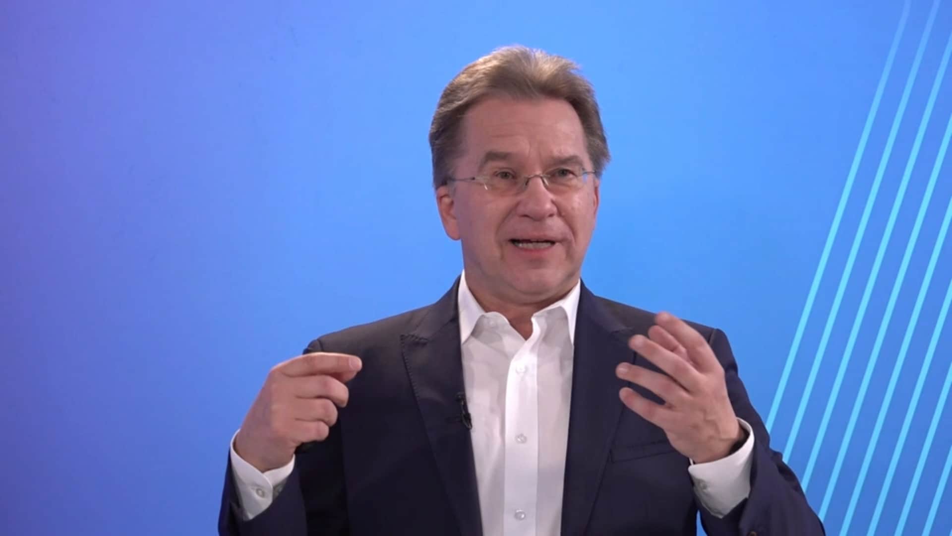 Benedict Kober, Vorstandssprecher Euronics Deutschland, im Gespräch mit TV-Moderatorin Katrin Bauerfeind anlässlich der Eröffnung des digitalen Euronics Kongresses am 9. März.