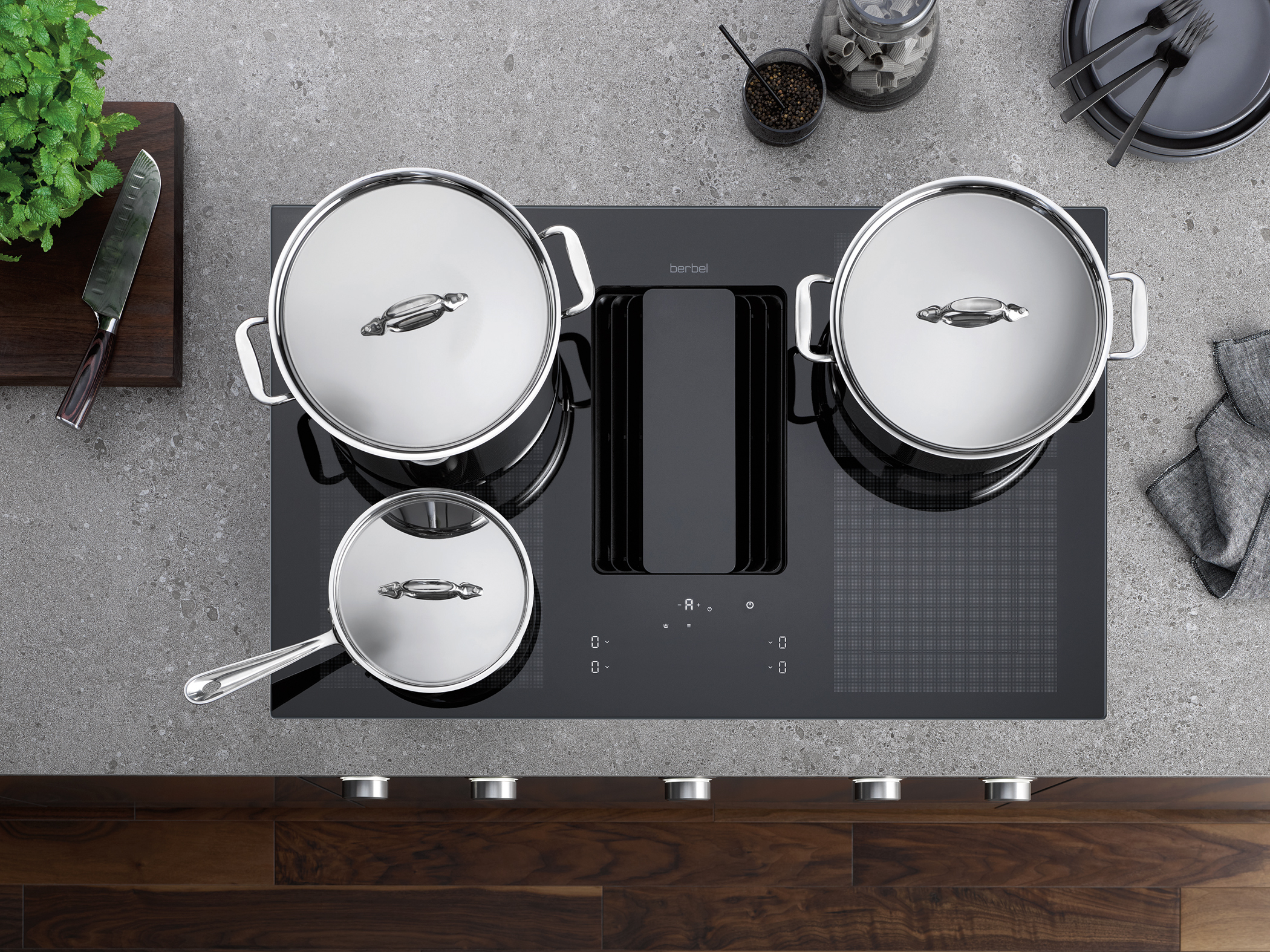 Der Berbel Dunstabzug Downline Infinity ist ein Induktionskochfeld mit Muldenlüfter in einer Breite von 900 mm und 550 mm Tiefe. Die Dimensionen und eine großzügige Aufteilung der Fläche machen es möglich, alle vier Kochzonen des Induktionskochfeldes gleichzeitig zu nutzen – auch für Pfannen.