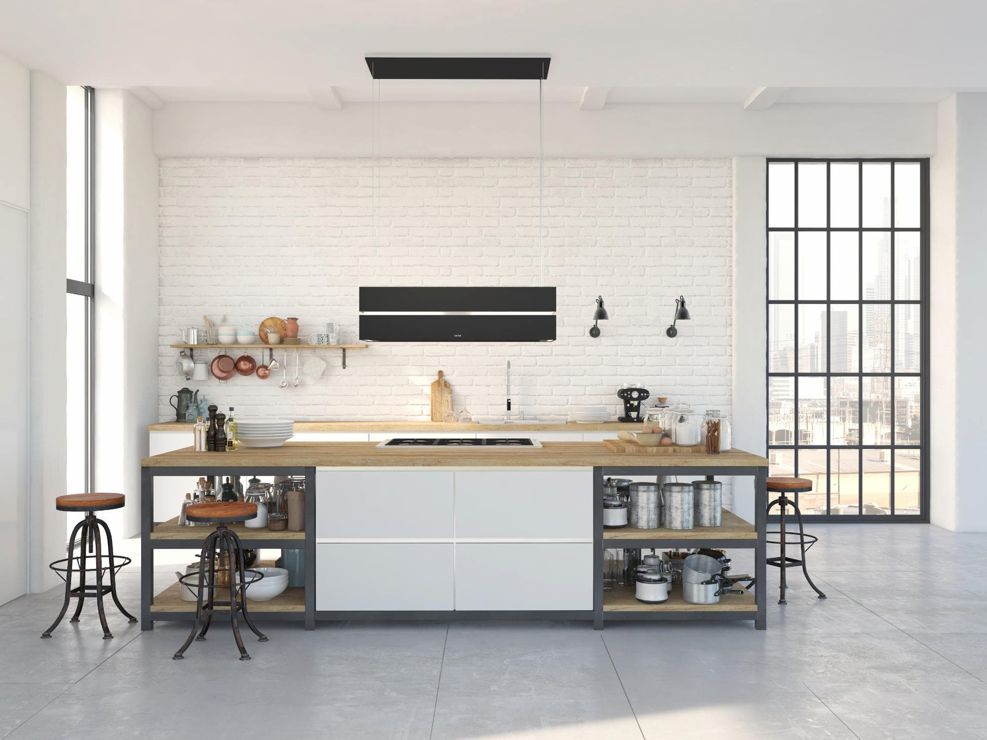 Inselhaube Skyline Edge der Black Edition von Berbel mit matt-schwarz satiniertem Glas.