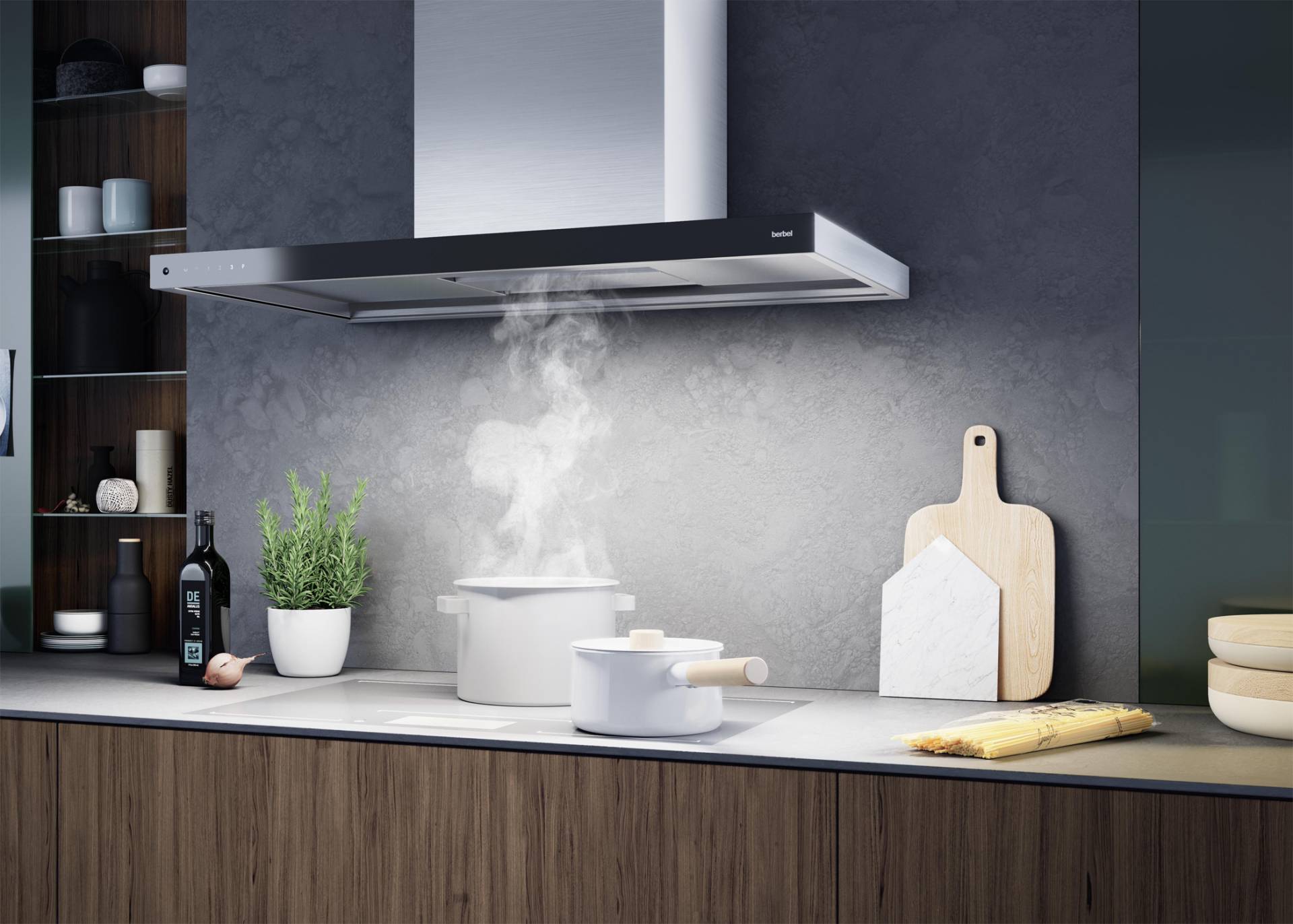 In den Seitenbereichen und auf der Vorderseite der Wandhaube wird ein leichter Luftstrom ausgestoßen. Dieser führt die aufsteigenden Wrasen zum Ansaugspalt in der Mitte. So ist eine rundum optimale Wrasenerfassung garantiert.