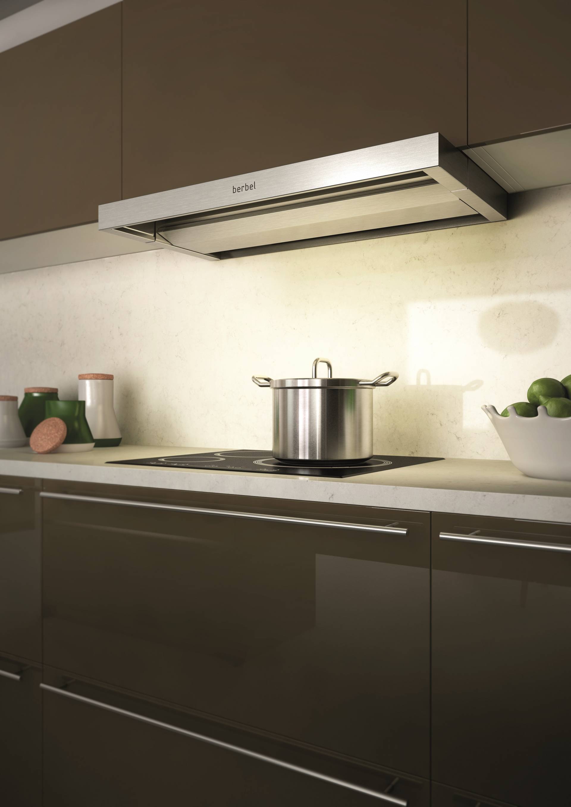 Die Berbel Dunstabzugshaube Moveline BEL90ML ist nur sichtbar, wenn sie gebraucht wird. Per Knopfdruck fährt sie über Töpfen und Pfannen aus. So werden auch die Dunstwrasen der vorderen Herdplatten komplett erfasst. Der neue EC-Motor sorgt dafür, dass extrem leise und energiesparend die Luft gereinigt wird. Nach dem Kochen bewegt der Liftmechanismus sie ganz einfach zurück in den Küchenoberschrank.