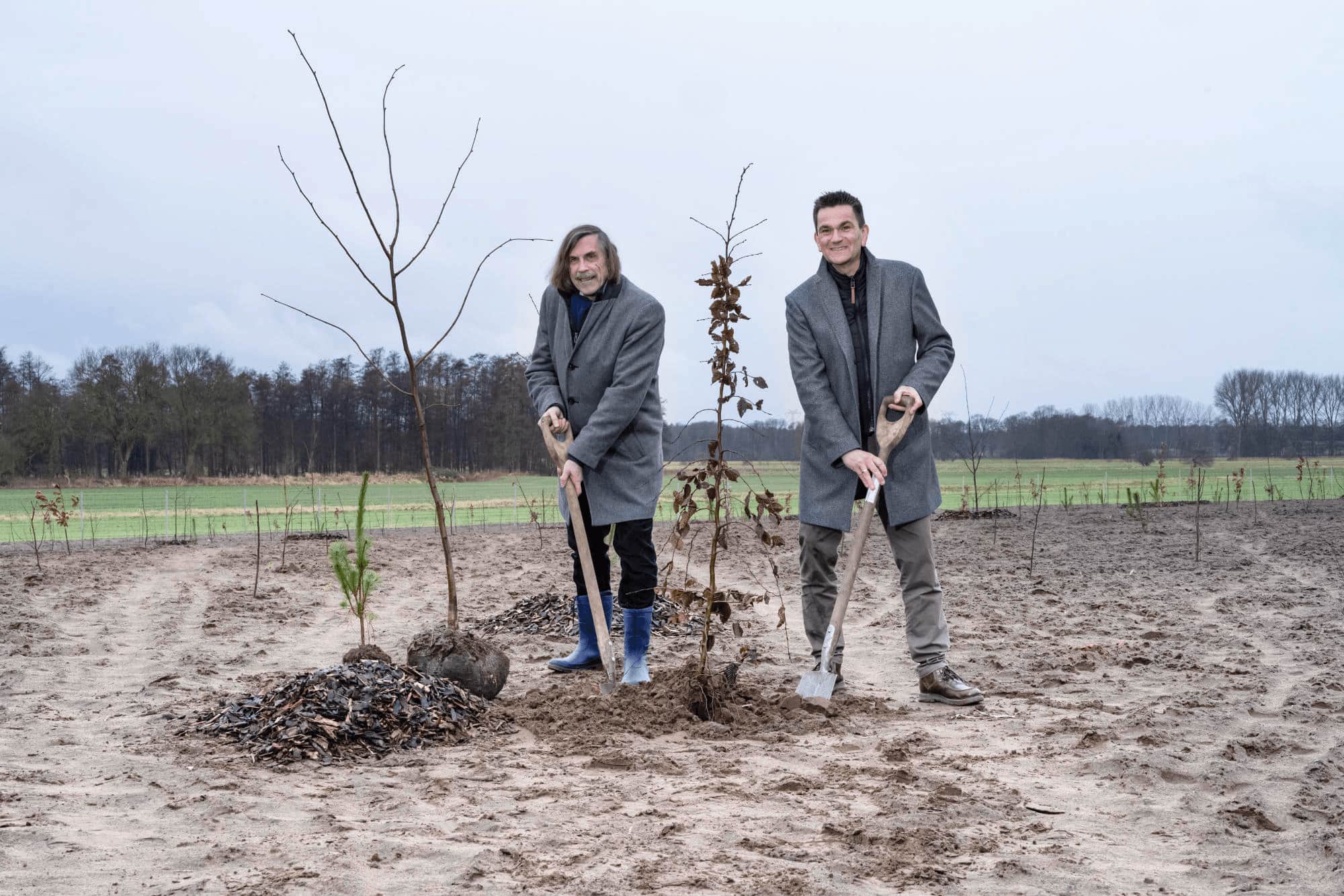 Norbert Morkes, Bürgermeister der Stadt Gütersloh (li.), und Dr. Stefan Breit, Technik-Geschäftsführer von Miele (re.), pflanzten symbolisch einen von insgesamt 1.300 Bäumen. (Foto: Miele).