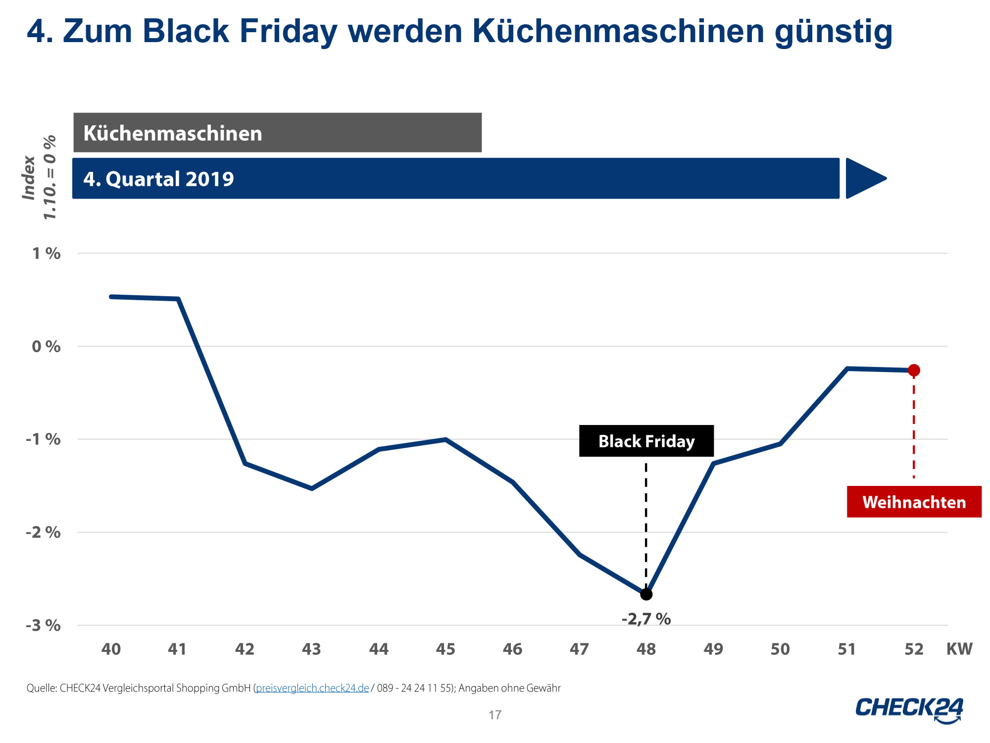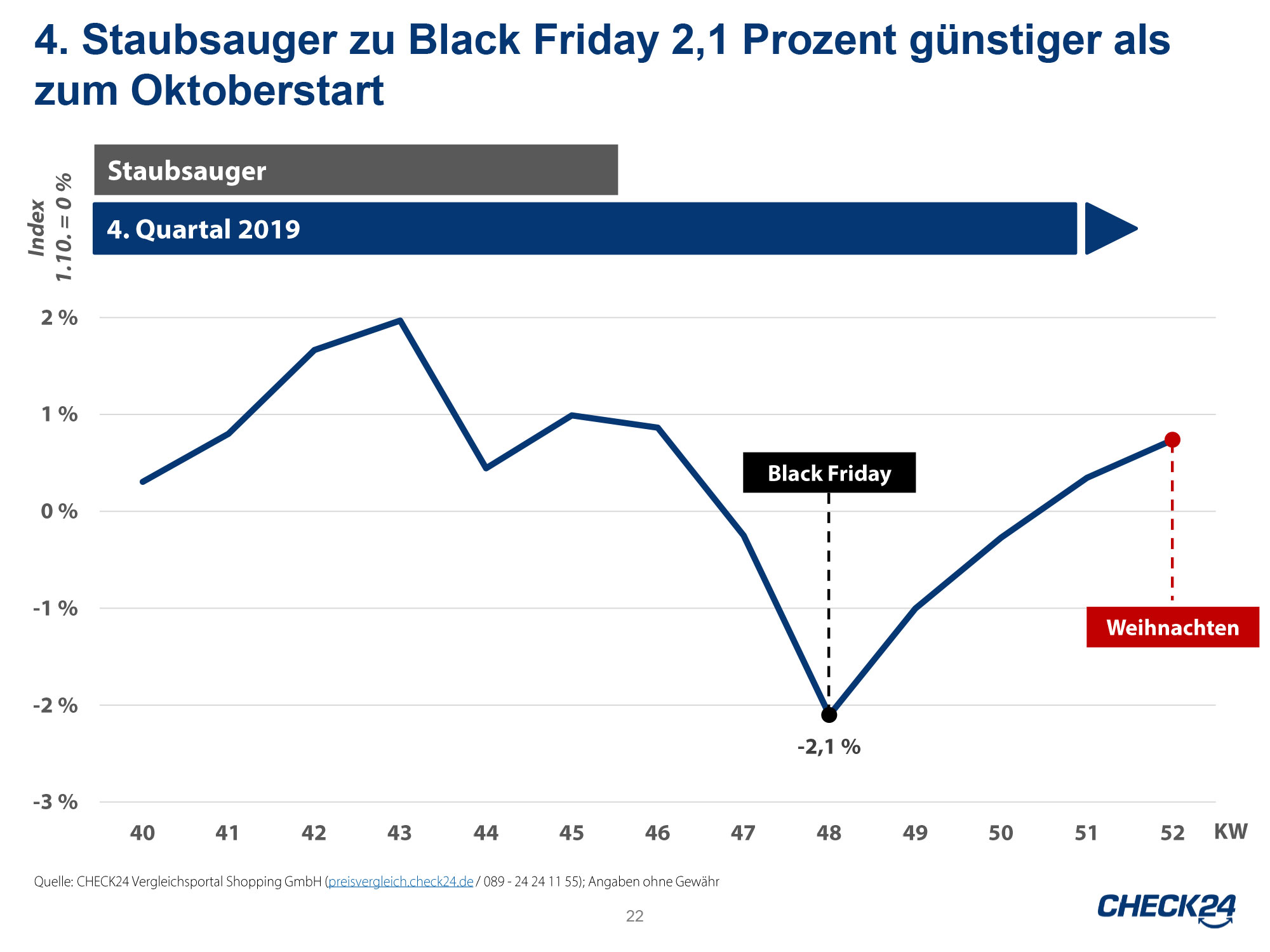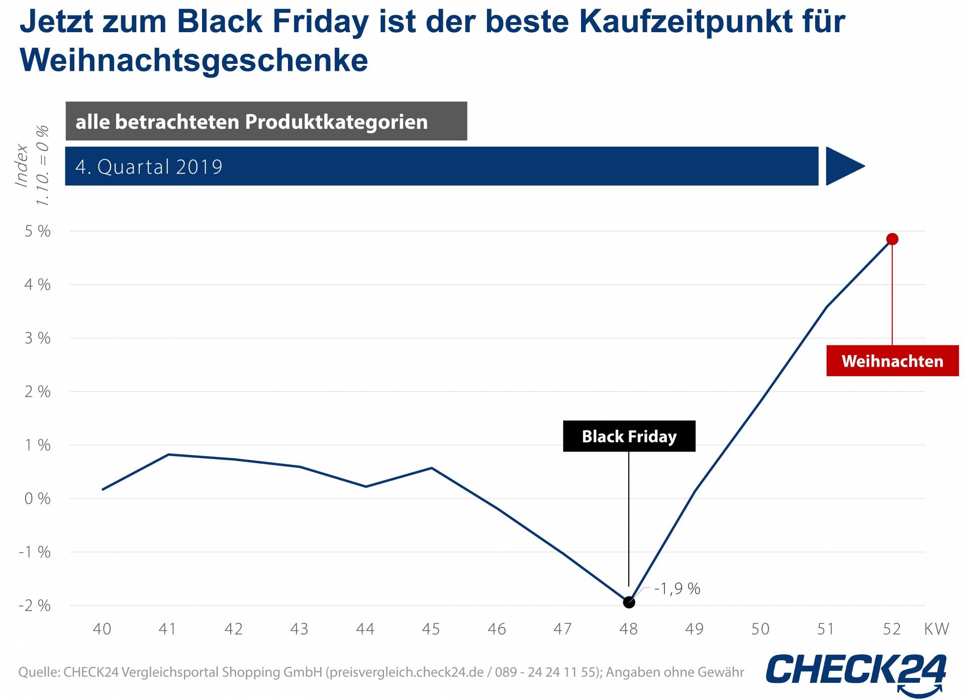 - Der Black Friday ist ein guter Kaufzeitpunkt für Weihnachtsgeschenke. Der Check24-Shoppingpreisindex fiel im vergangenen Jahr von Anfang Oktober bis Ende November zum Black Friday um 1,9% auf einen Tiefstand.