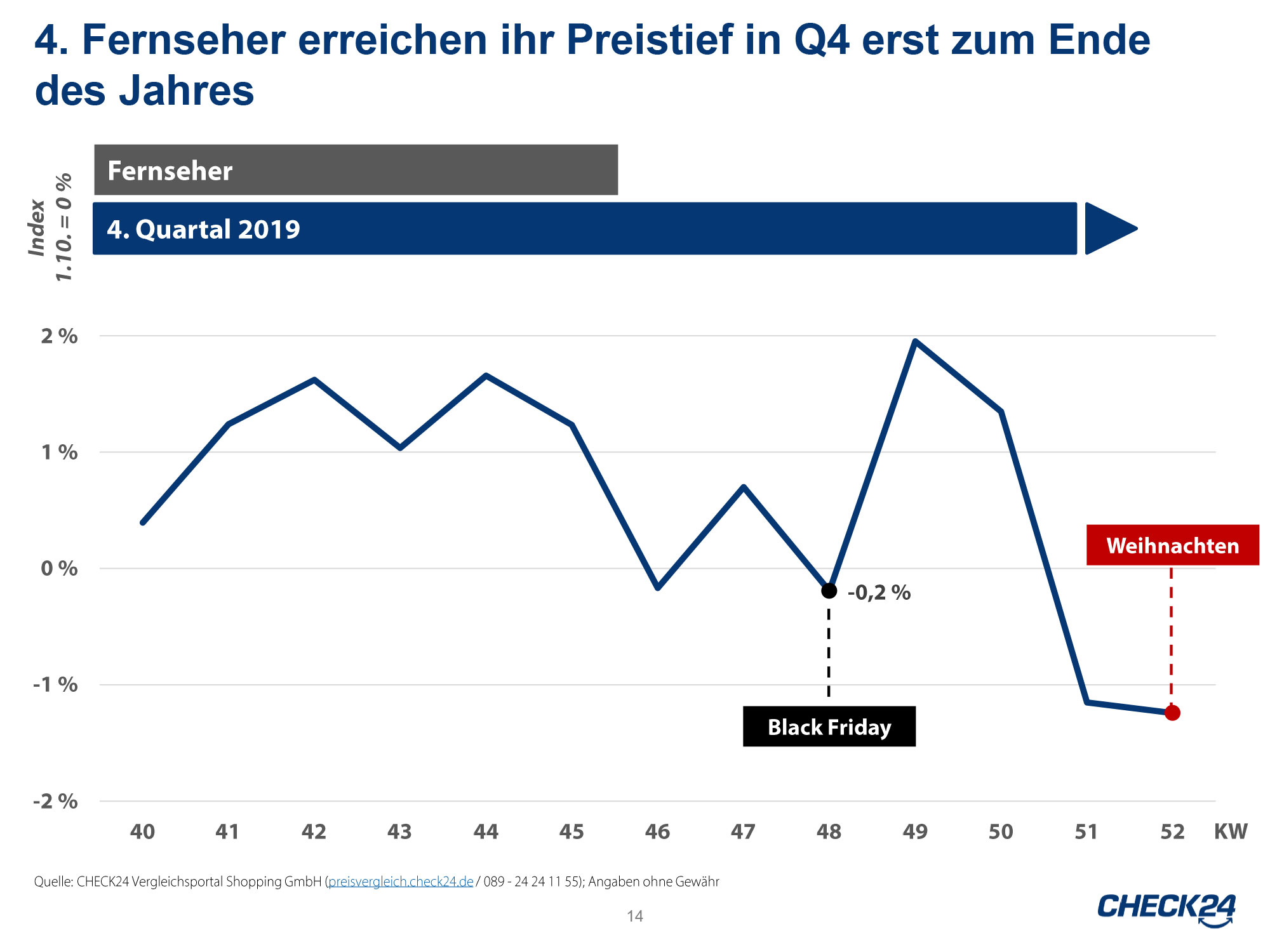 Ganz anders dagegen das Geschehen im TV-Markt: Fernseher erreichen ihr Preistief nach Erkenntnissen von Check24 erst zu Ende des Jahres, also nicht wie fälschlicherweise vermutet, am Black Friday.