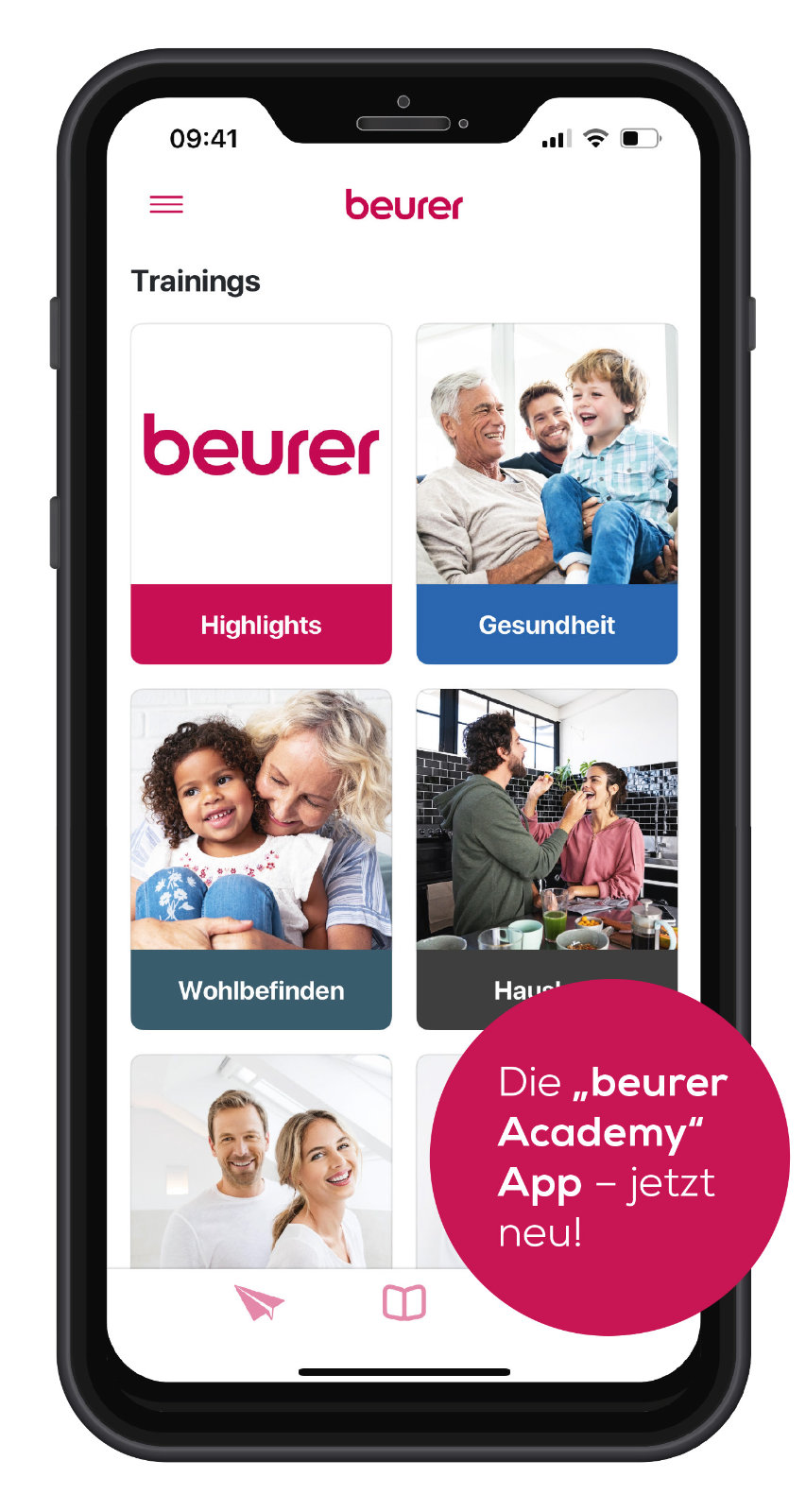 News, Produkte, Trainings sind die Hauptbestandteile der Beurer Academy App.