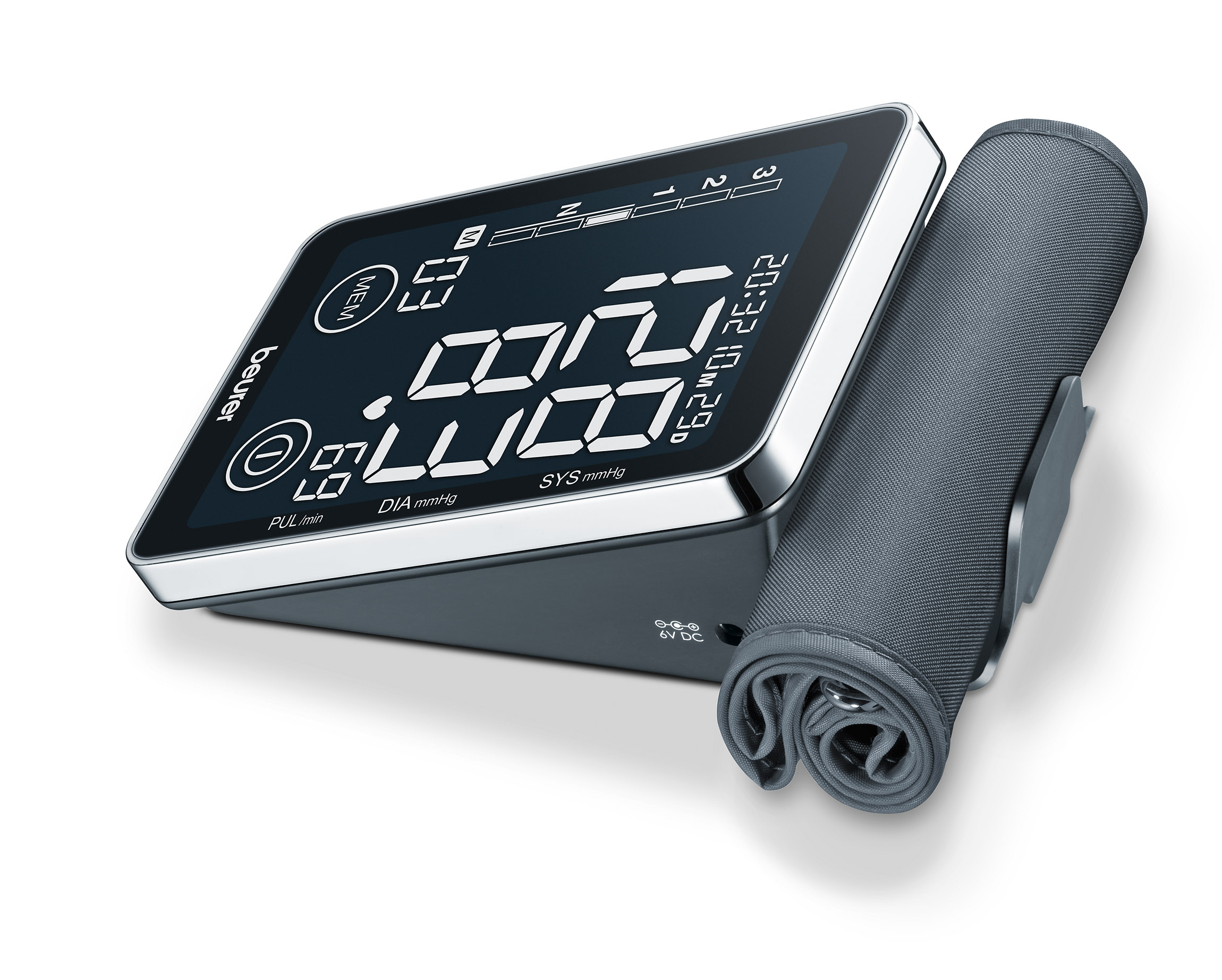Das BM58 fällt sofort durch sein markantes Äußeres ins Auge – ein schwarzes, glänzendes Gehäuse und auffallende Chrom-Kanten verleihen ihm einen ganz besonderen Look. Der große Touchscreen unterstützt diesen Effekt zusätzlich und bietet daneben noch einen weiteren großen Vorteil: den Verzicht auf jegliche Tastenelemente zugunsten eines großen Displays mit gut ablesbaren Zahlen und Symbolen. Das BM58 überzeugt jedoch nicht nur mit Äußerlichkeiten. Dank des WHO*-Indikators und einer integrierten Arrhythmie-Erkennung steht das Oberarmsmessgerät für hohe Präzision und Sicherheit bei der Blutdruckmessung.