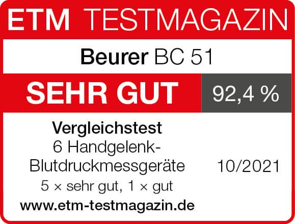 Das ETM Testmagazin hat in der aktuellen Ausgabe (10/2021) verschiedene Handgelenk-Blutdruckmessgeräte getestet. Das Gerät von Beurer hat das Testurteil „sehr gut“ erhalten.