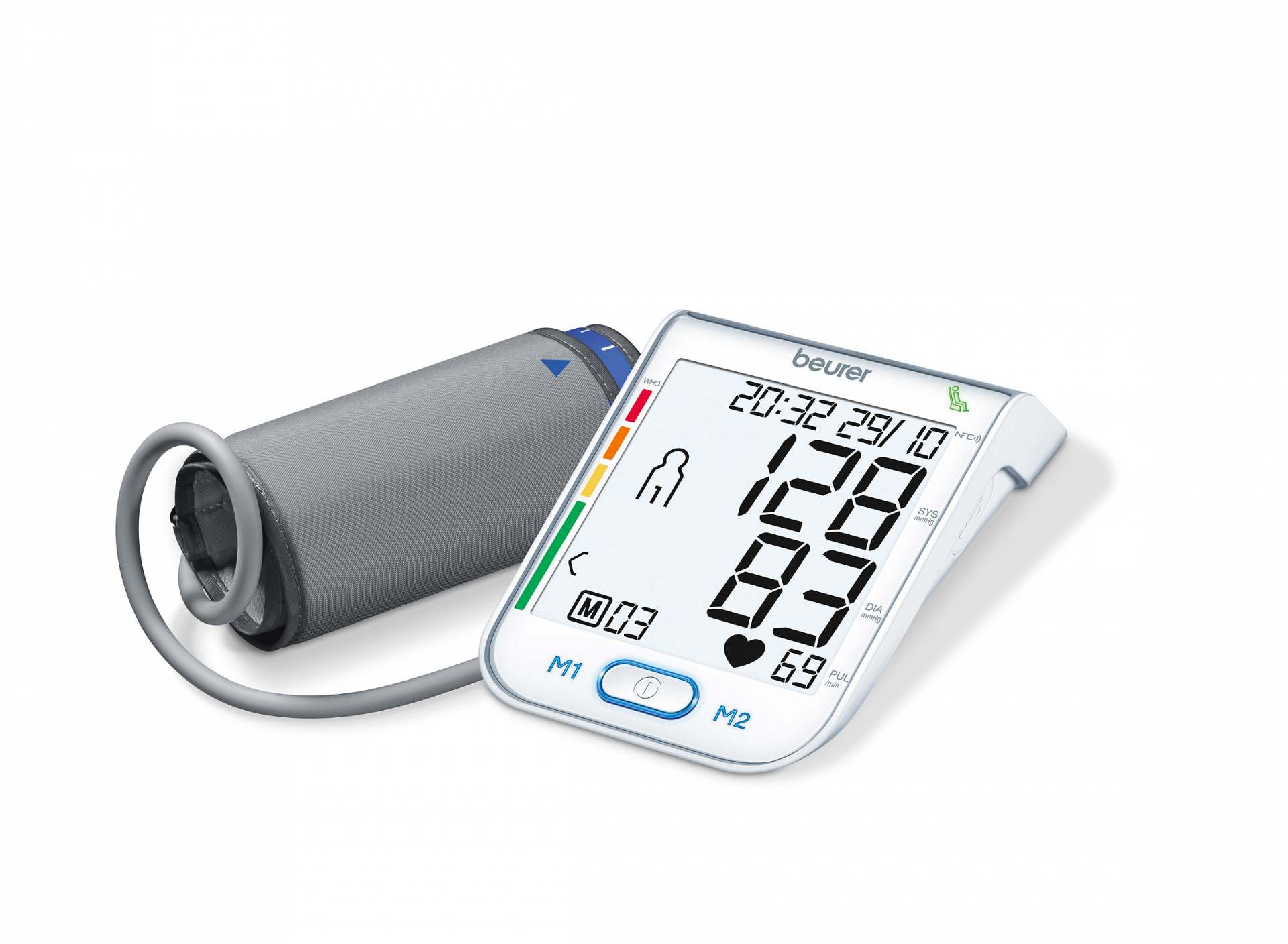 Das Beurer Blutdruckmessgerät BM75 ist NFC-fähig und somit für die kabellose Übertragung der Messergebnisse an das Smartphone geeignet. Hierzu wird einfach das Smartphone über das Display des Blutdruckmessgeräts gehalten und die Werte werden sofort in der HealthManager App gespeichert, die eine unkomplizierte Datenarchivierung und -verwaltung ermöglicht. Die blaue Sensor-Touch Bedienung und das große weiß hinterleuchtete Display erleichtern die Handhabung ebenso wie der blau beleuchtete Start/Stopp-Knopf. Zusätzlich verfügt das Medizinprodukt über den patentierten Ruheindikator, der eine gültige Messung nur bei ausreichender körperlicher und geistiger Ruhe