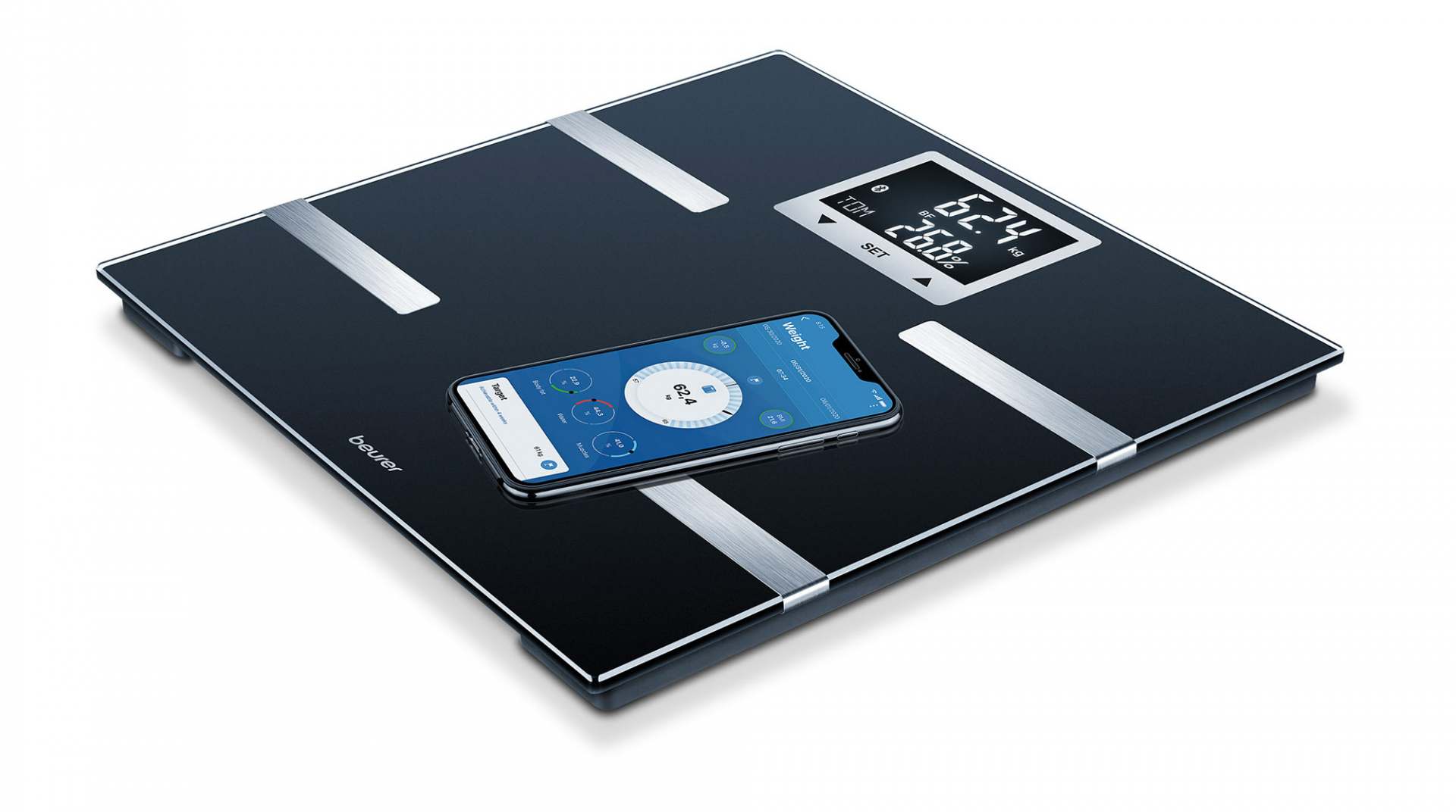 Die Beurer Diagnosewaage BF 720 liefert neben Gewichtsangabe, Körperfett, Wasser-, Muskel- und Knochenmasse viele Zusatzinfos zur Körperbalance wie die Kalorienanzeige AMR/BMR. Mit App-Anbindung erfolgt die Anbindung der Werte das Smartphone.