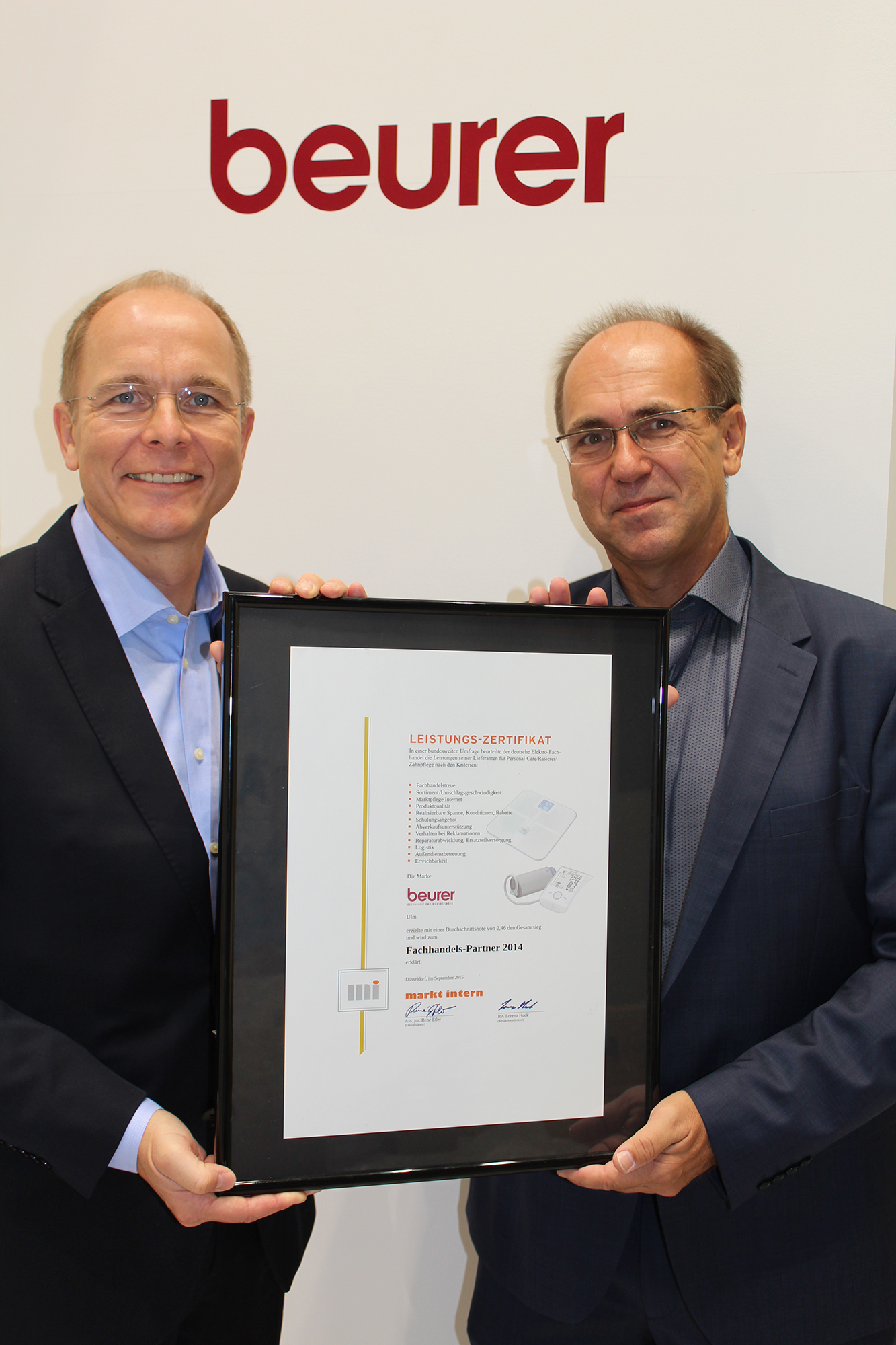 Im aktuellen Leistungsspiegeltest, der jährlich von „markt intern“ durchgeführt wird, wurde Beurer zum Leistungsspiegelsieger 2015 und somit als Fachhandelspartner Nr. 1 in der Produktgruppe „Personal Care, Rasierer und Zahnpflege“ ausgezeichnet. Bestandteile des „markt intern“-Leistungsspiegels sind u.a. Kriterien wie Logistik, Fachhandelstreue, Verhalten bei Reklamationen, Reparaturabwicklung, Marktpflege Internet und realisierbare Spanne. Hierbei belegte Beurer jeweils den ersten Platz.