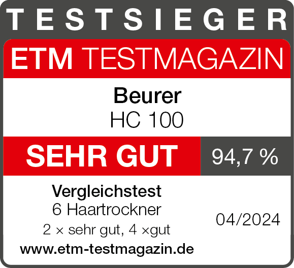Im Vergleichstest des ETM Testmagazin wurden in Ausgabe 04/2024 sechs Haartrockner getestet. Zu den Besten gehört der Beurer High Speed Haartrockner HC 100 Excellence, der als Testsieger überzeugte.