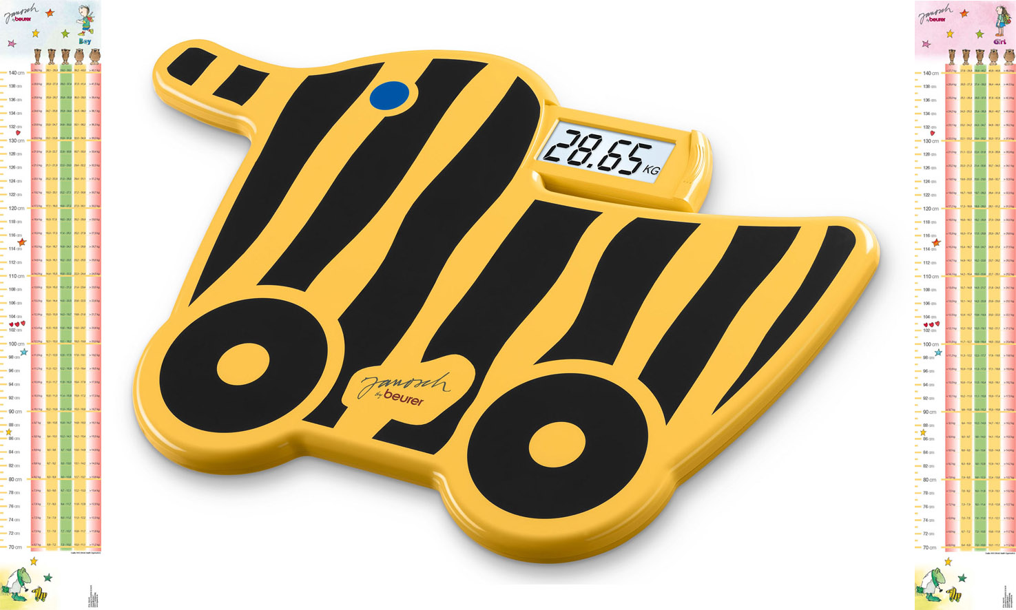 Die Beurer Janosch Personenwaage (JPS 11) übernimmt das Wiegen von Groß und Klein. Mit der kindgerechten Einteilung in 50g-Schritten haben Eltern jede noch so geringe Veränderung des Gewichts ihrer Kinder immer genau im Blick. Zudem kann an Hand der beigefügten Messlatte mit integrierter Gewichtsüberprüfung nach WHO-Standard (World Health Organisation) schnell ein Über- oder Untergewicht des Kinds festgestellt und entsprechend eingegriffen werden.