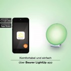 Der Beurer Lichtwecker WL 90 vereint Lichtwecker, Stimmungslicht, Leselampe und Musikstation in einem Produkt. Das Gerät sorgt nicht nur durch seine Simulation des Sonnenaufgangs mit schrittweise heller werdendem Licht für ein natürliches Aufwachen, sondern erleichtert ebenfalls das Einschlafen durch Simulation des Sonnenuntergangs. Die Basisfunktionen können direkt am Gerät gesteuert werden. Mit dem eigenen Smartphone und der dazu passenden Beurer LightUp App kann der Nutzer die erweiterten Funktionen nutzen, wie beispielsweise den Musikplayer, die Auswahl von Stimmungslicht-Szenen, das Fixieren einer bestimmten Farbe, das Einstellen des Alarms und dessen unterschiedlichen Einstellungen sowie das Ein- und Ausschalten des Tastentons. Zudem kann das Smartphone über einen USB-Anschluss geladen werden.