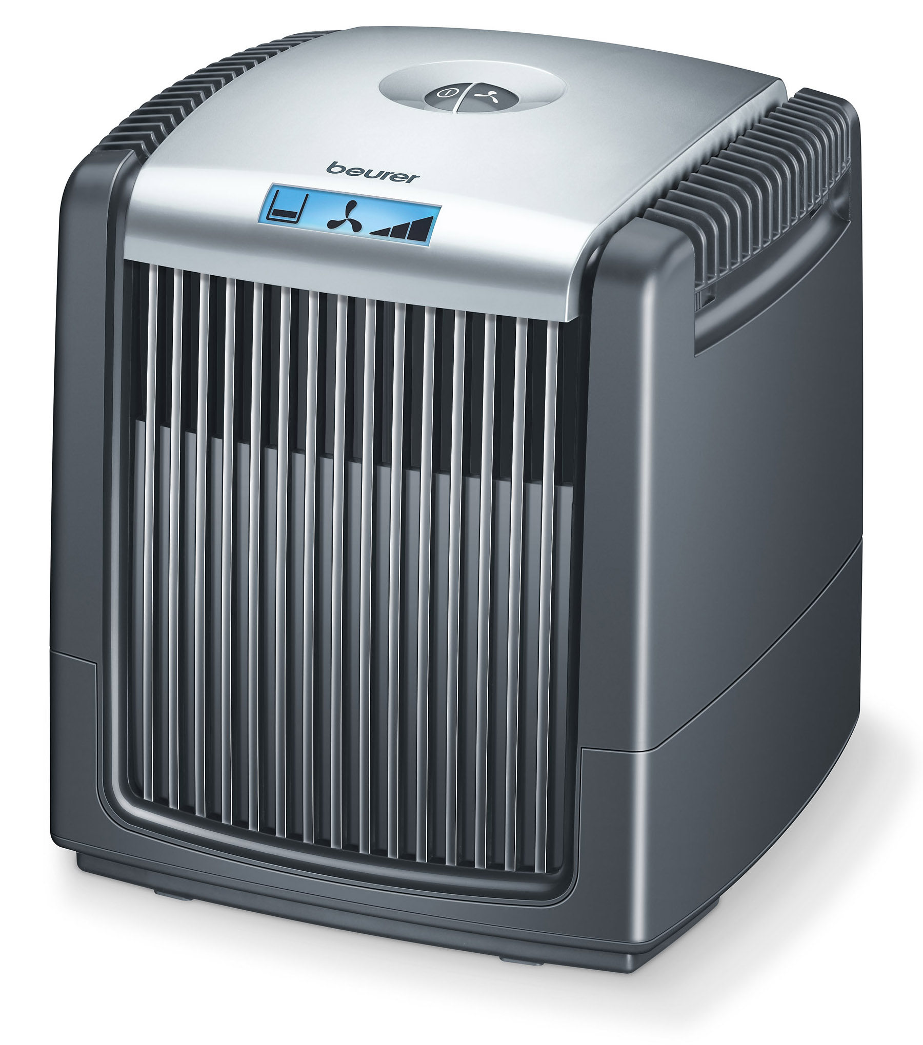 Der Beurer Luftwäscher LW 220 bietet Luftbefeuchtung und –reinigung. Er befeuchtet zu trockene Luft durch Kaltverdunstung und reinigt gleichzeitig die Luft von Hausstaub, Pollen, Tierhaaren und Gerüchen. Wie in der Natur vom Regen wird die Luft „reingewaschen“: Luft streicht an den drehenden Befeuchterscheiben vorbei und nimmt Wassermoleküle auf. Luftpartikel wie Hausstaub, Pollen, Tierhaare haften an den Scheiben und werden im Wasserbad abgewaschen. Dies ist besonders hygienisch, da keine Filtermatten involviert sind.