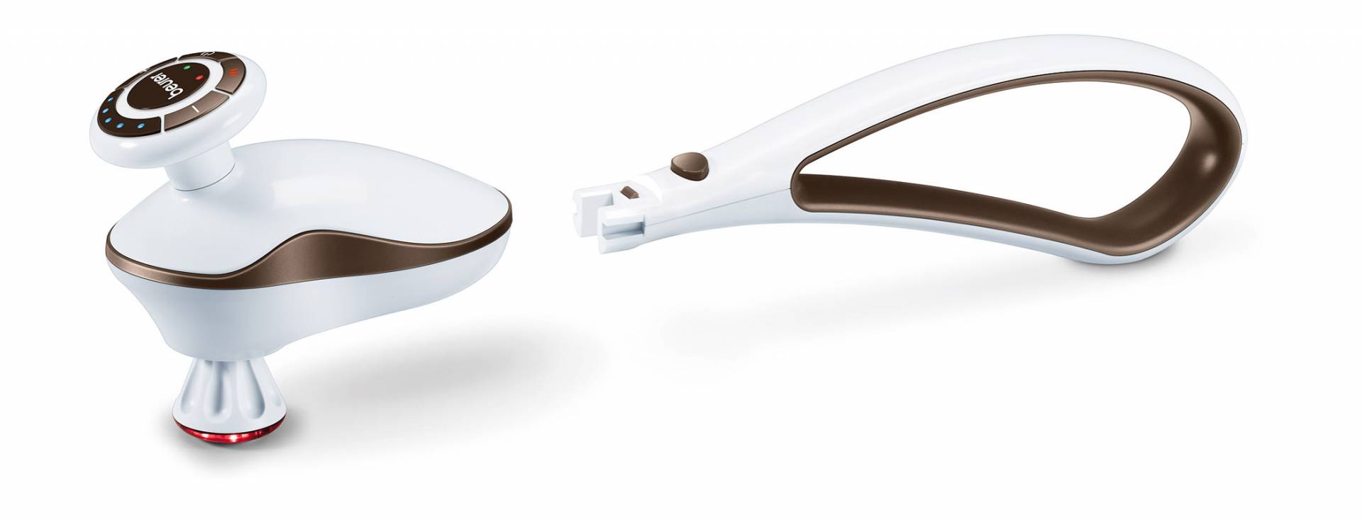Die Funktionsanzeige ist farbig hinterlegt. Weitere Anpassungen können durch vier auswechselbare Massageaufsätze mit Drehfixierung vorgenommen werden: Wärmeaufsatz, Kälteaufsatz, Softausatz und Trigger-Punkt Aufsatz. Der Handgriff ist abnehmbar, sodass das Handteil in jede Tasche passt und ohne lästiges Kabel genutzt werden kann. Das Gerät ist mit einer Akku- und Ladeanzeige sowie einer Abschaltautomatik ausgestattet. Die Leistungsstärke beträgt 22,5 Watt.