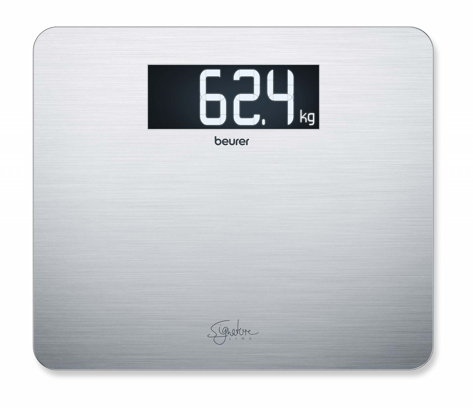 Die Beurer Personenwaage GS 405 ist eine Waage aus der Signature Line mit beleuchtetem XXL-Displays. Die Edelstahlwaage ermöglicht neben der Gewichtsmessung auch die Ermittlung des BMI und die Berechnung von Körperfett, Körperwasser, Muskelanteil, Knochenmasse sowie Grund- und Aktivitätsumsatz