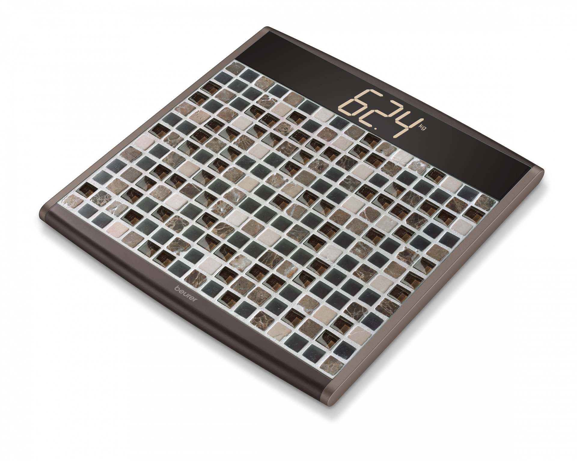 Die Beurer Personenwaage PS891 Mosaic verleiht jedem Wellnessbad eine ganz individuelle Note. Die Trittfläche des Wiegegeräts besteht aus rund 220 Mosaiksteinen, die von Hand ausgewählt und aufgeklebt wurden. Damit wird jedes Exemplar der PS891 Mosaic zu einem echten Kunstwerk, das in dieser Form nur einmal existiert. Ebenso hochwertig wie die Verarbeitung sind auch die eingesetzten Materialien: Die Mosaiksteine bestehen aus Glas und poliertem Naturstein in harmonischen Brauntönen. Dieses elegante Design unterstreicht das luxuriöse Flair der Personenwaage und ist zudem beim Wiegen Wellness pur für die Füße, da die Trittfläche einen leichten Massageeffekt bietet.