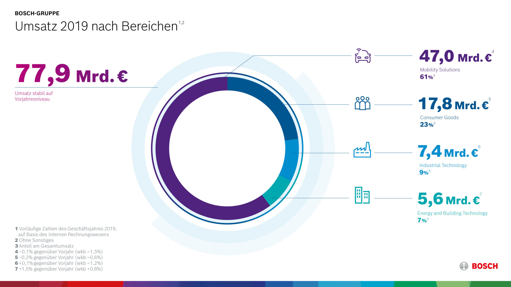 Die Bosch-Gruppe konnte 2019 trotz Konjunkturschwäche in der Automobilbranche das hohe Umsatzniveau des Vorjahres halten. Nach vorläufigen Zahlen erzielte das Technologie- und Dienstleistungsunternehmen 2019 einen Umsatz von 77,9 Mrd. EUR. Die Erlöse entsprechen damit dem Vorjahreswert, gaben wechselkursbereinigt jedoch um 1,1% nach.